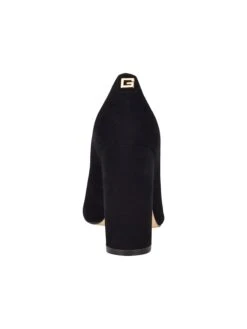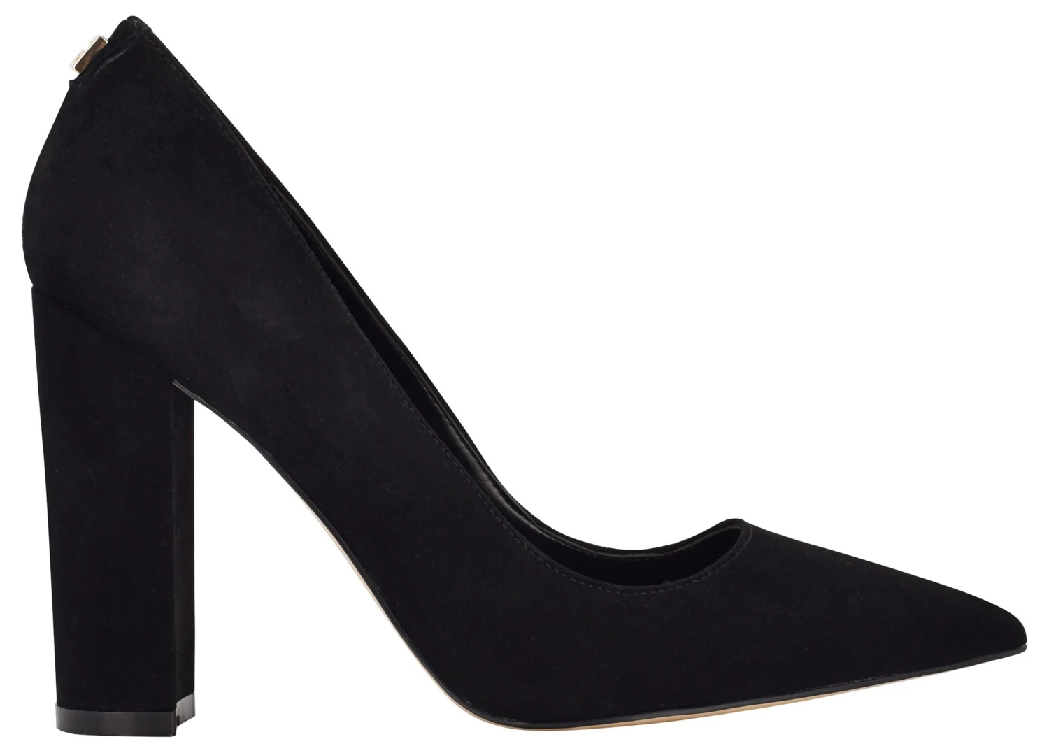 - Suede or faux leather upper in a block heel pump style with a pointed toe