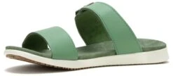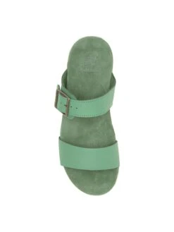 - Leather upper in a slide sandal style with an open toe.