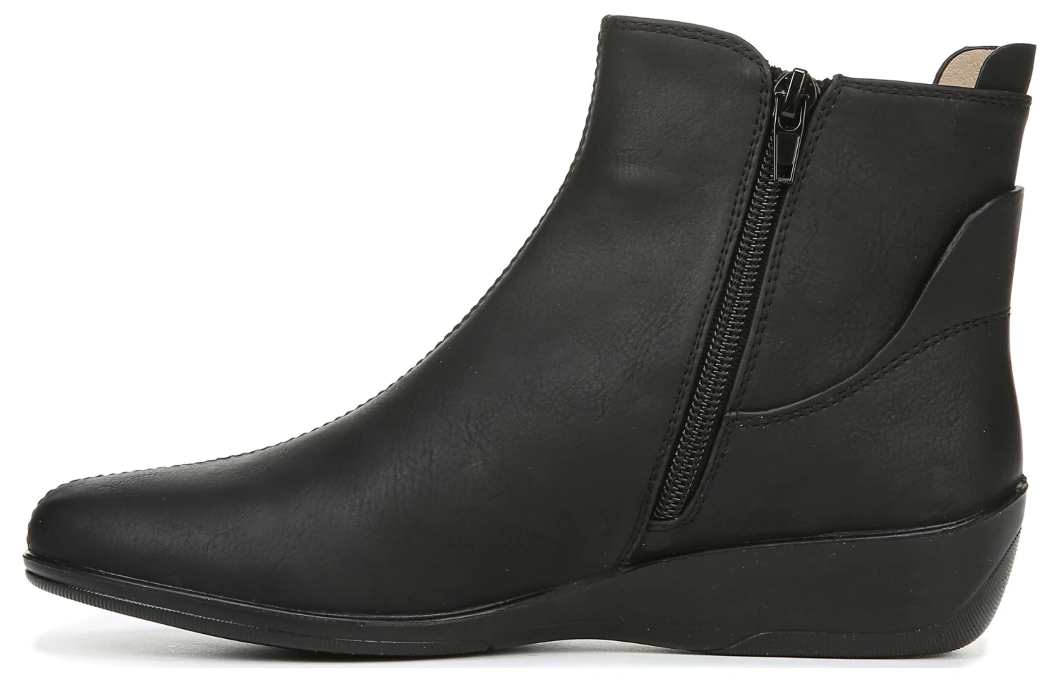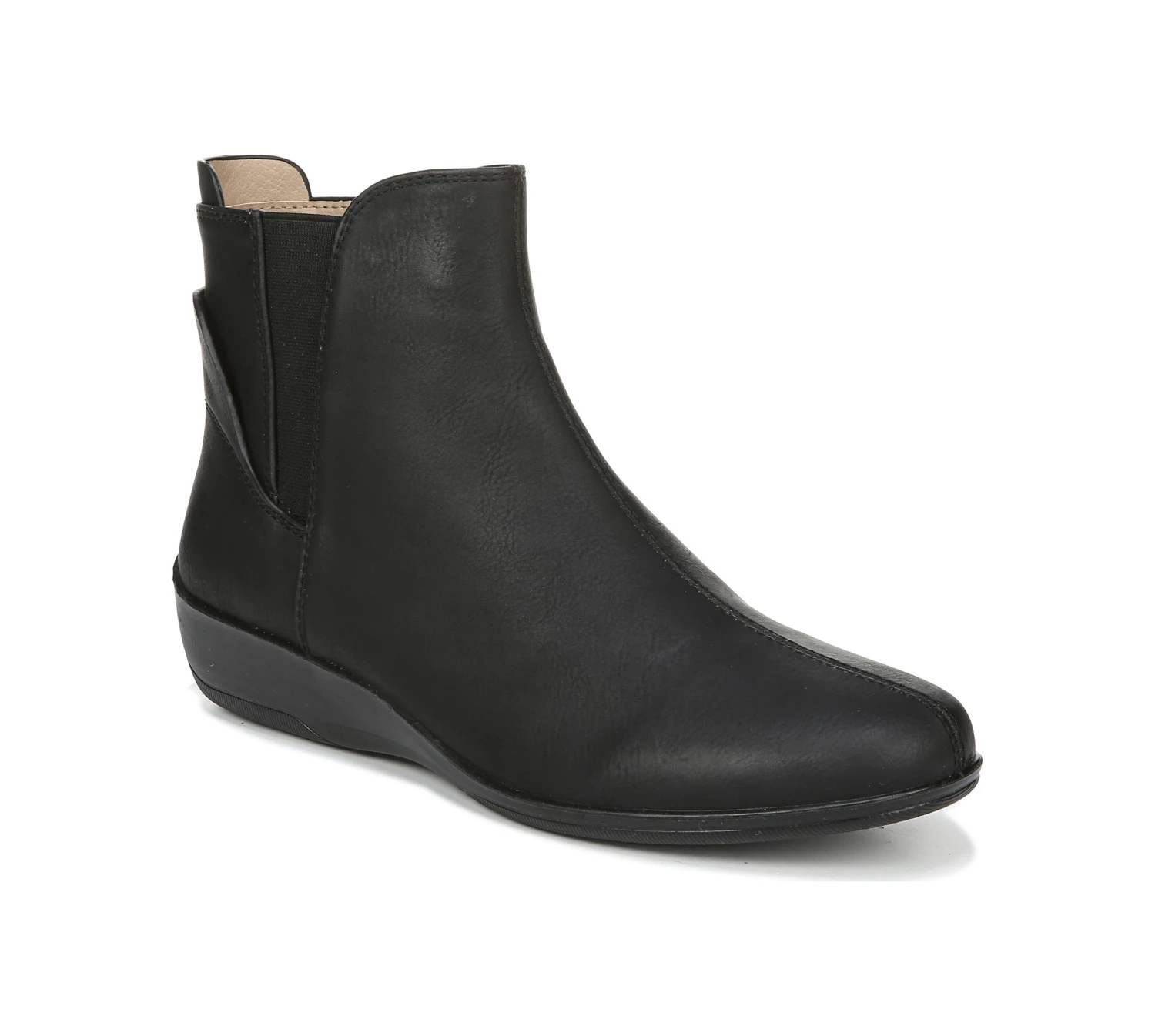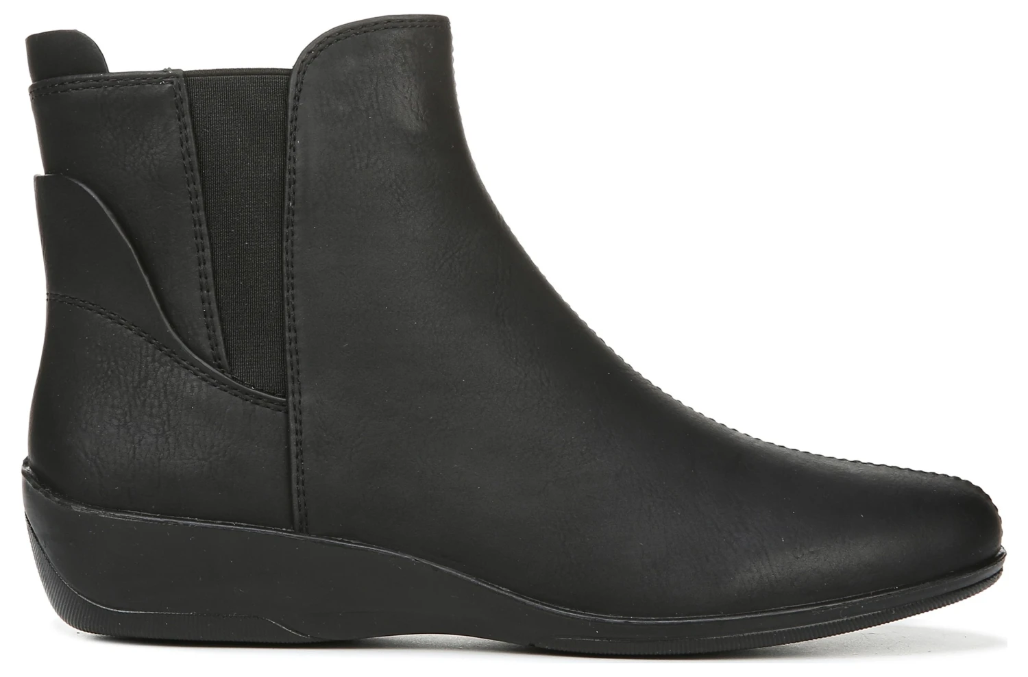 Step up your look in any weather with this sleek, water-resistant bootie. Water-resistant faux leather upper with a round toe, side zip, and stretch gore panels for extra flexibility.