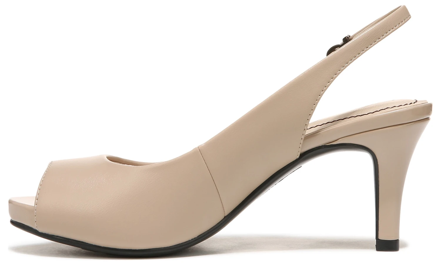 Walk into the room and own it in the Teller pump from LifeStride. Faux leather or fabric upper with a peep toe, heel sling strap and adjustable buckle closure.