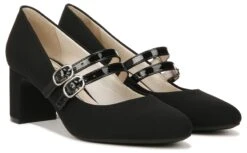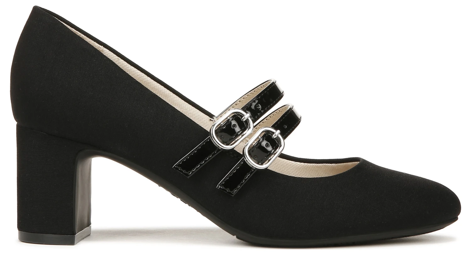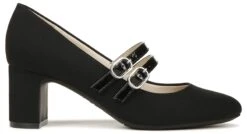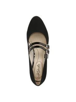 The modern Mary Jane. Coveted now, classic always, these womens dress shoes look of-the-moment with a nod to retro style. Faux patent leather or microsuede upper partially made with recycled materials, almond toe, slip-on fit, dual Mary Jane strap detail with adjustable metallic buckles and stretch gore, and cupped heel.