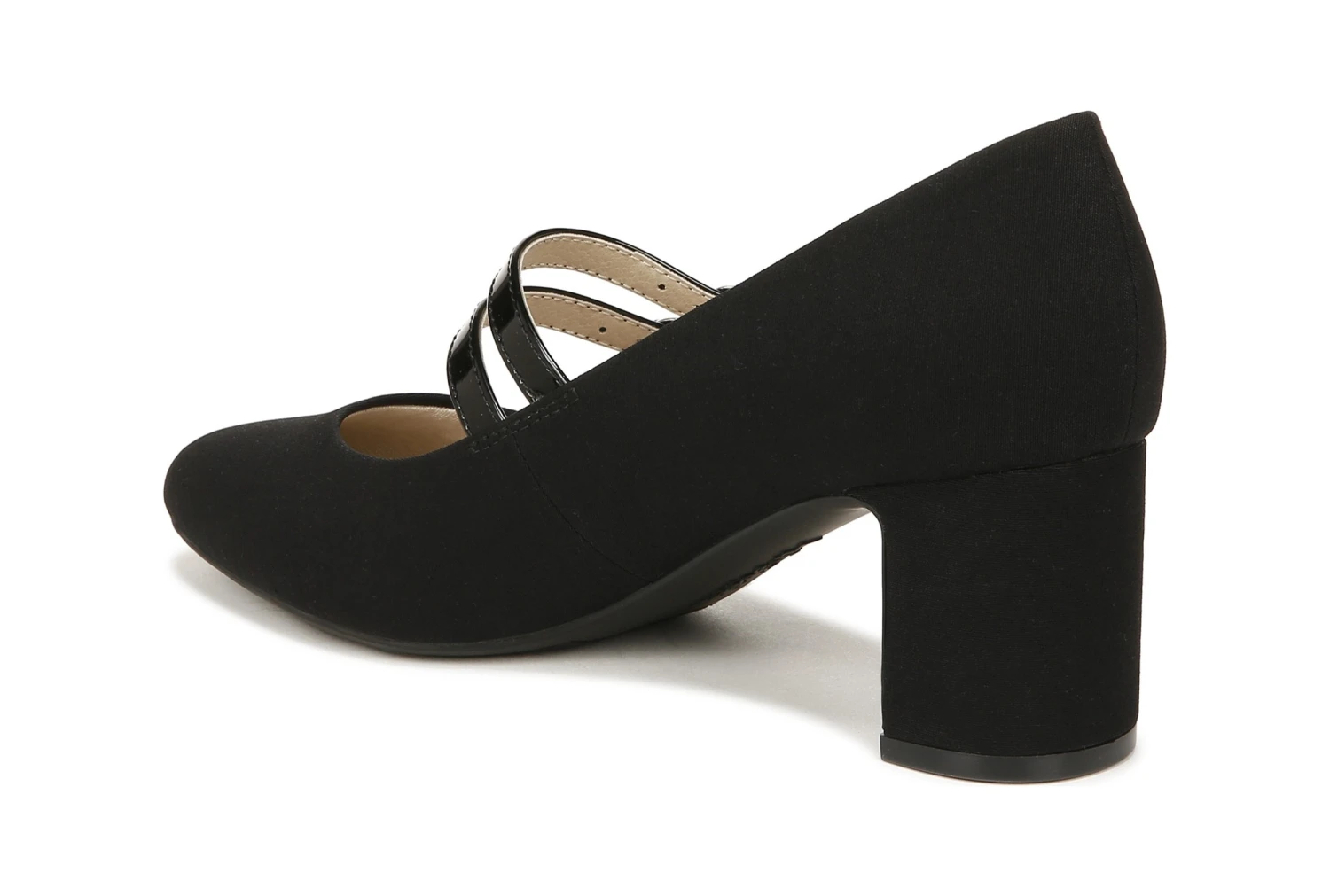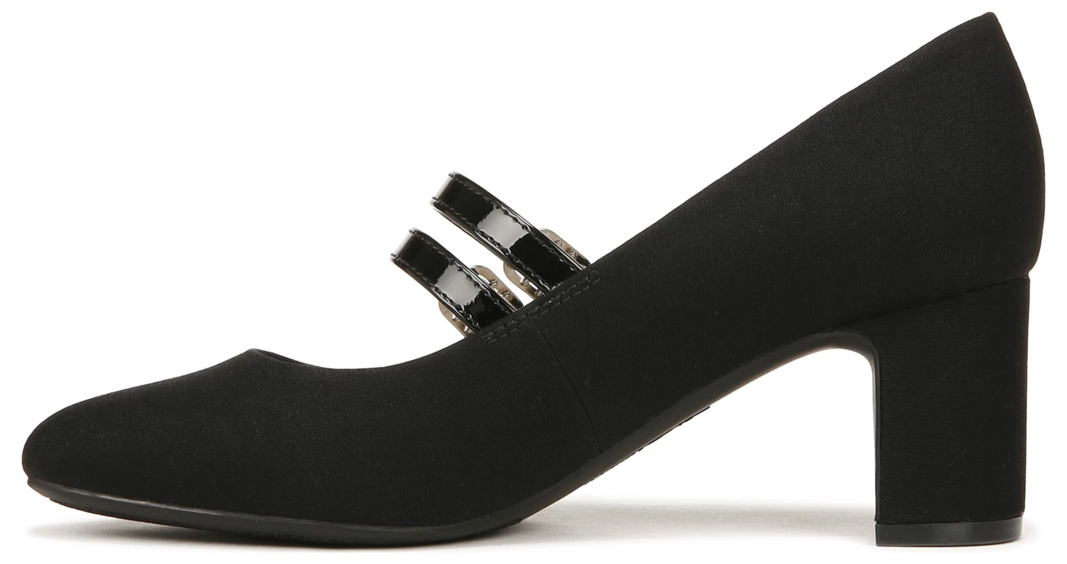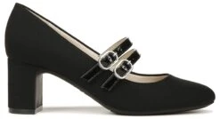 - Fabric upper in a mary jane pump style with a round toe