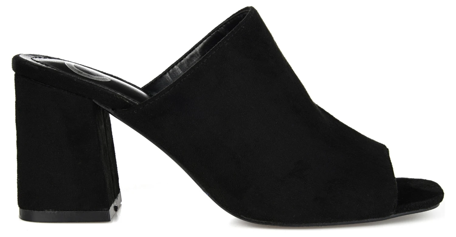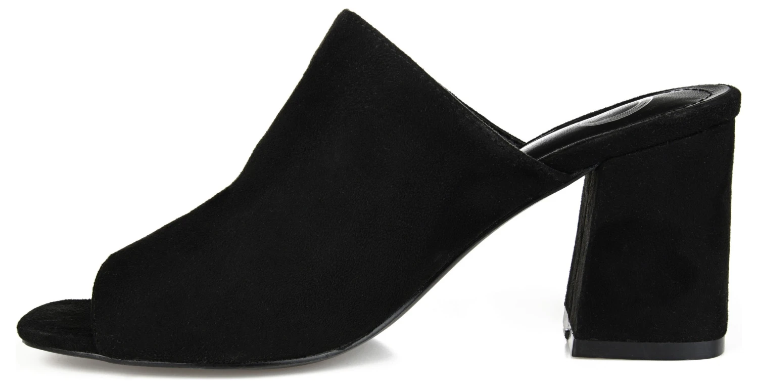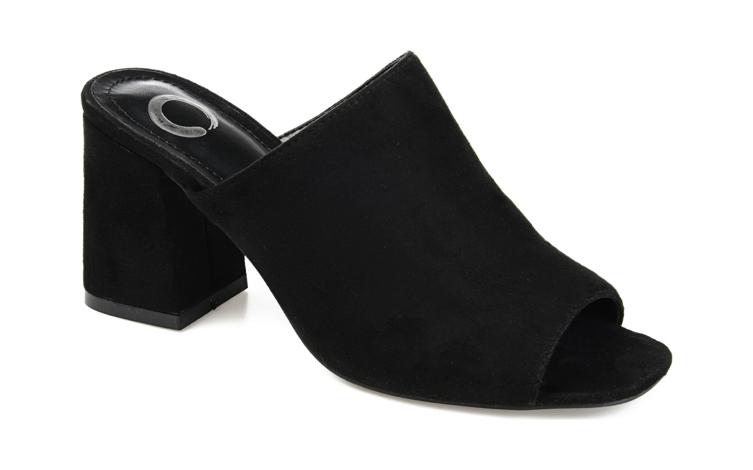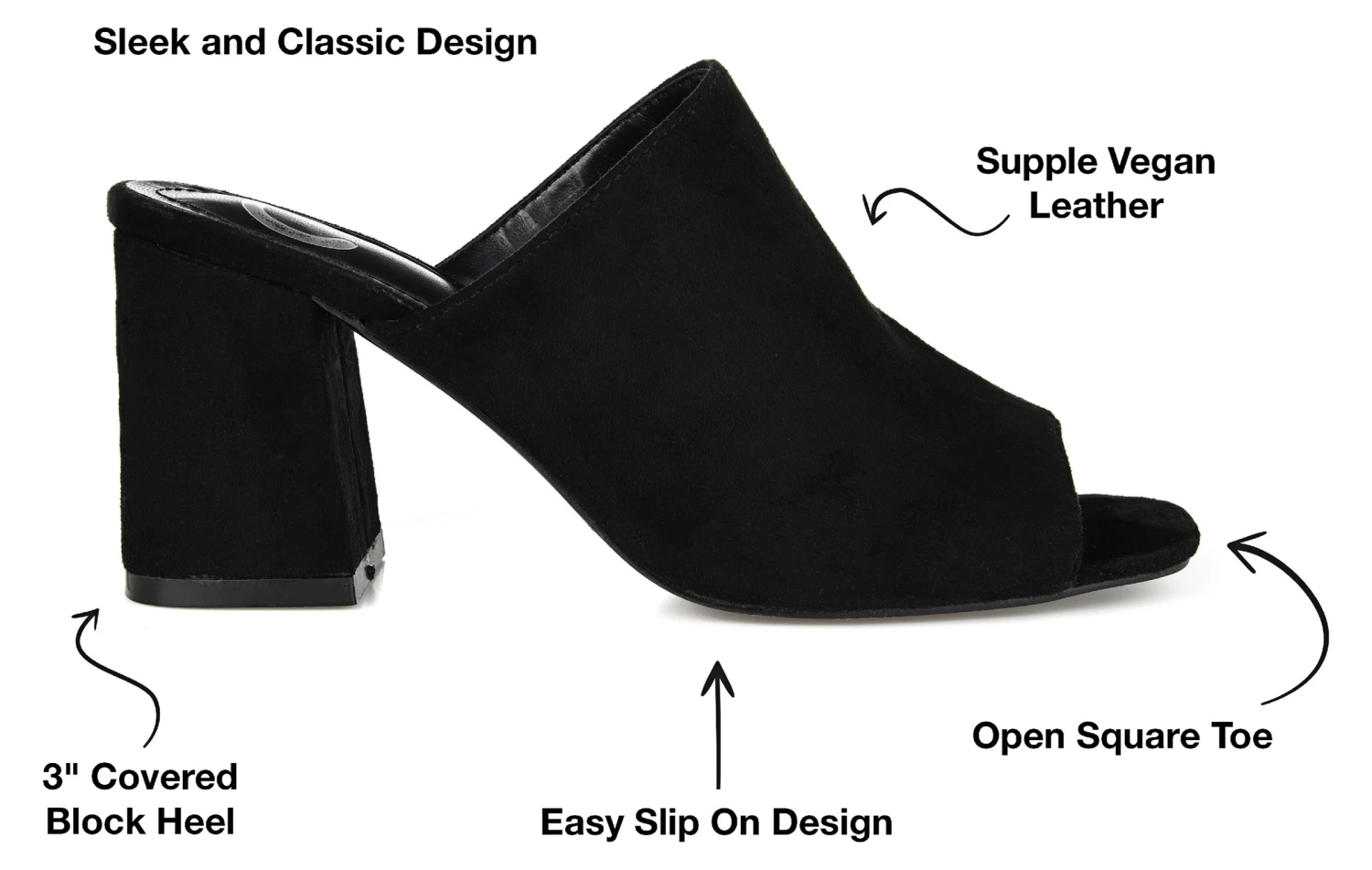 - Vegan suede upper in a block heel sandal style with a peep toe