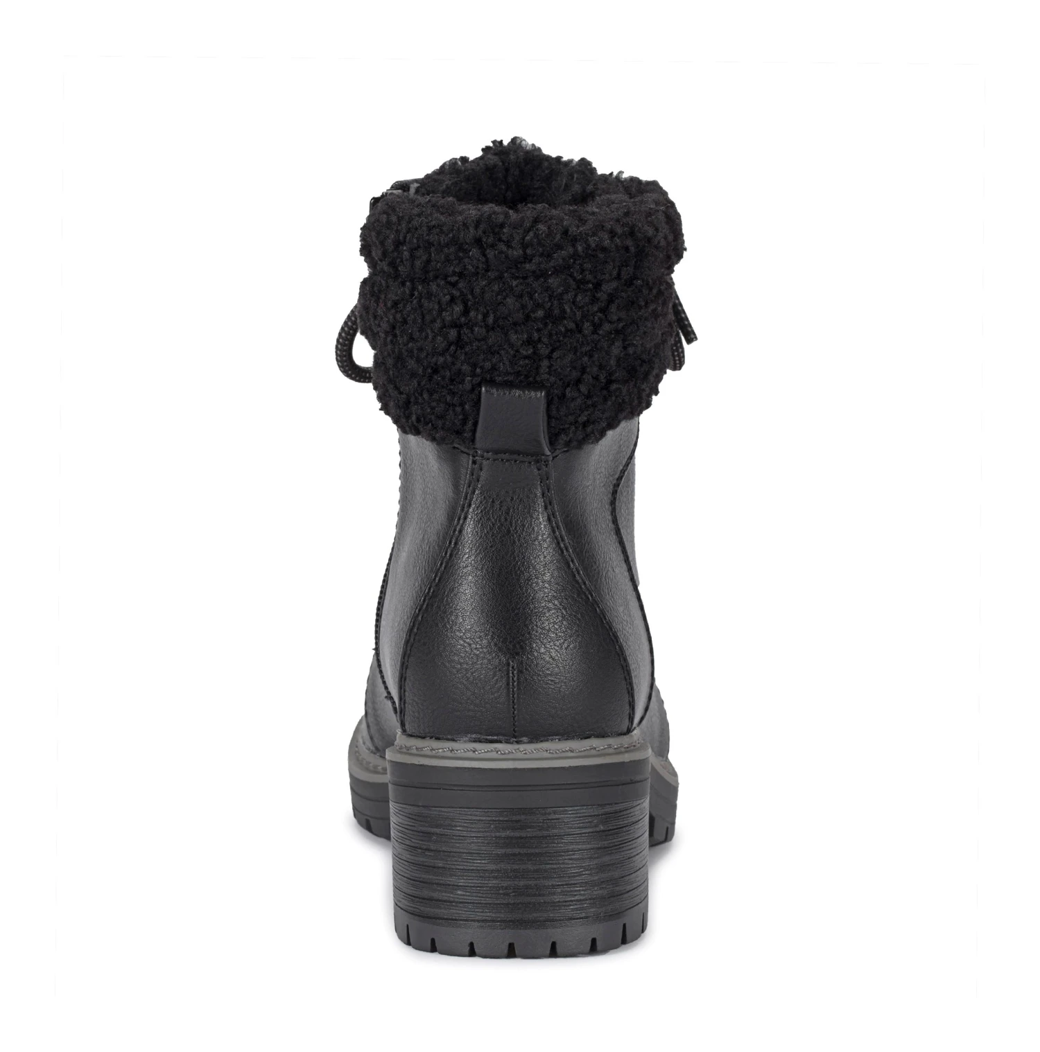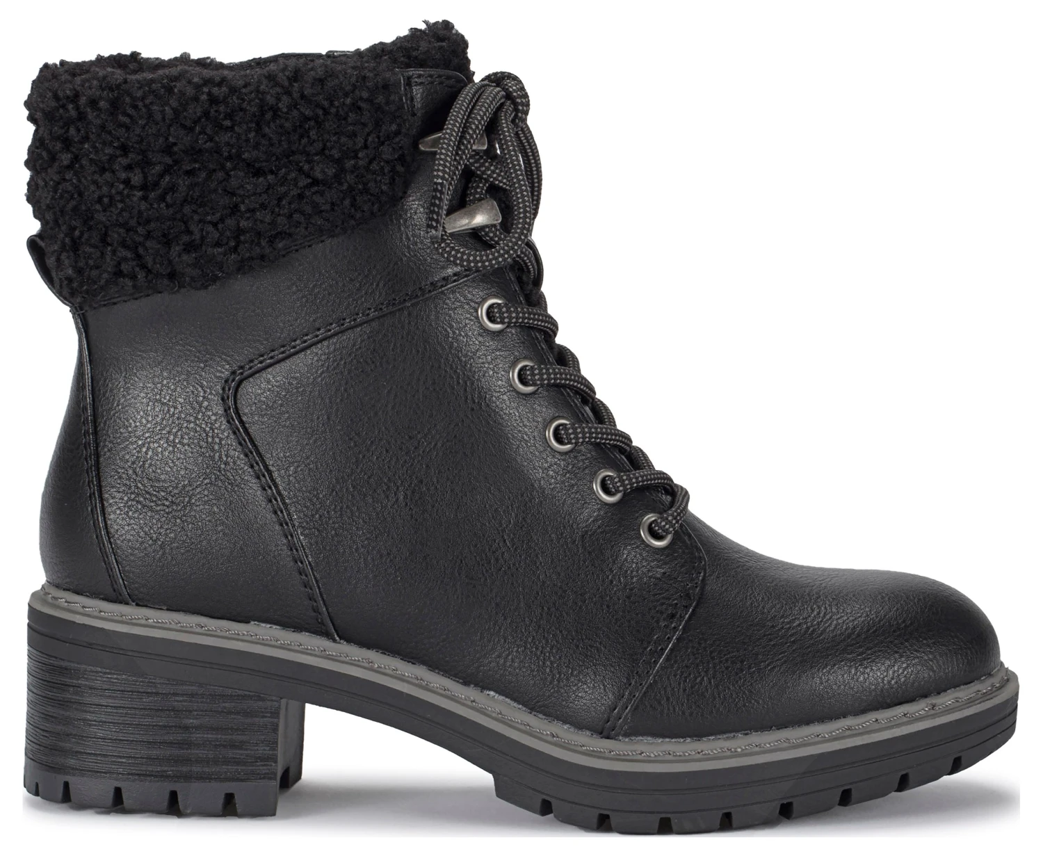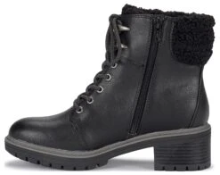 - Faux-leather upper in a lace-up boot style with a round toe