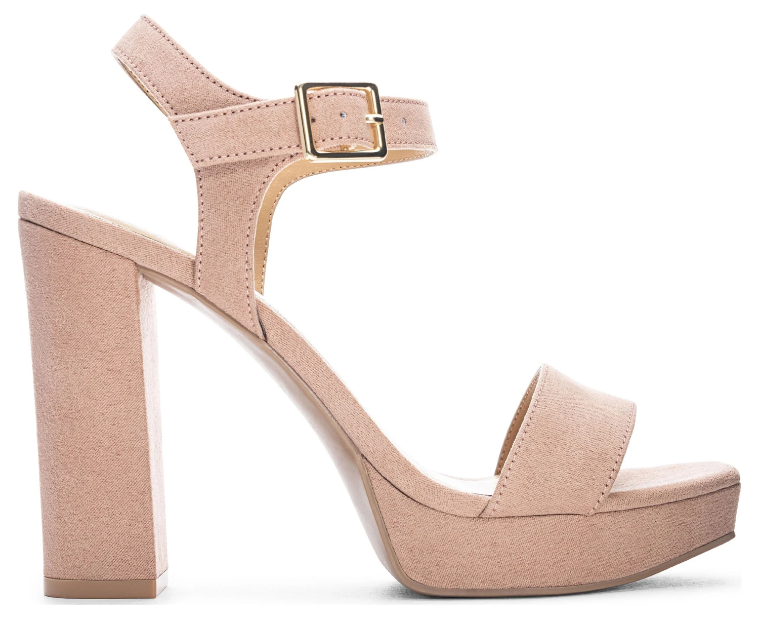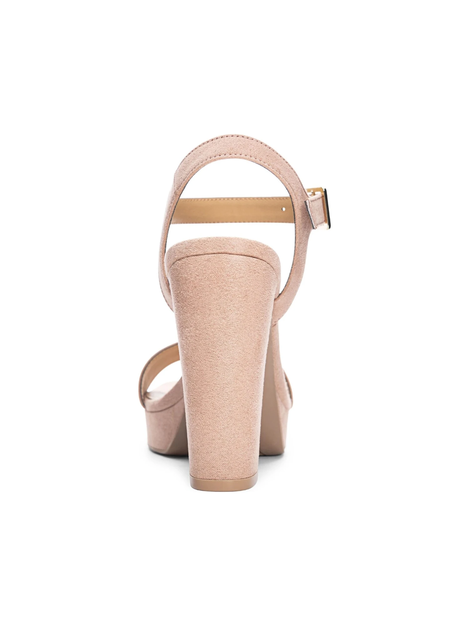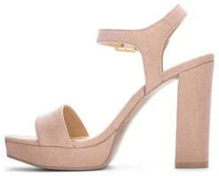 - Microsuede or synthetic upper in a platform dress sandal style with an open toe