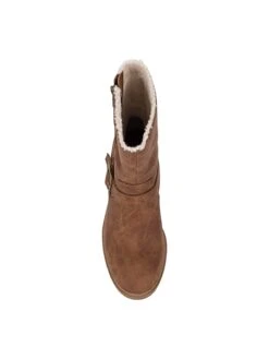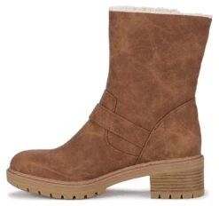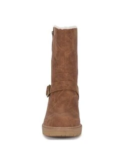 - Faux-leather upper in a motorcycle boot style with a round toe