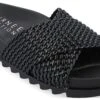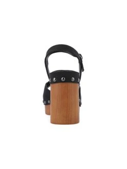 - Vegan leather upper in a platform heeled sandal with an open round toe