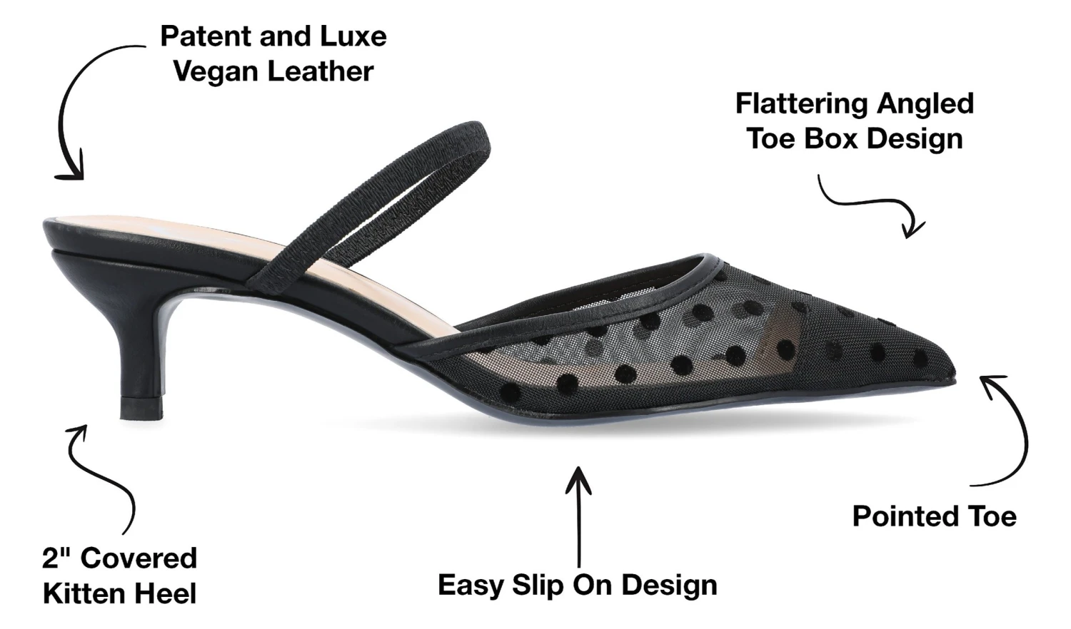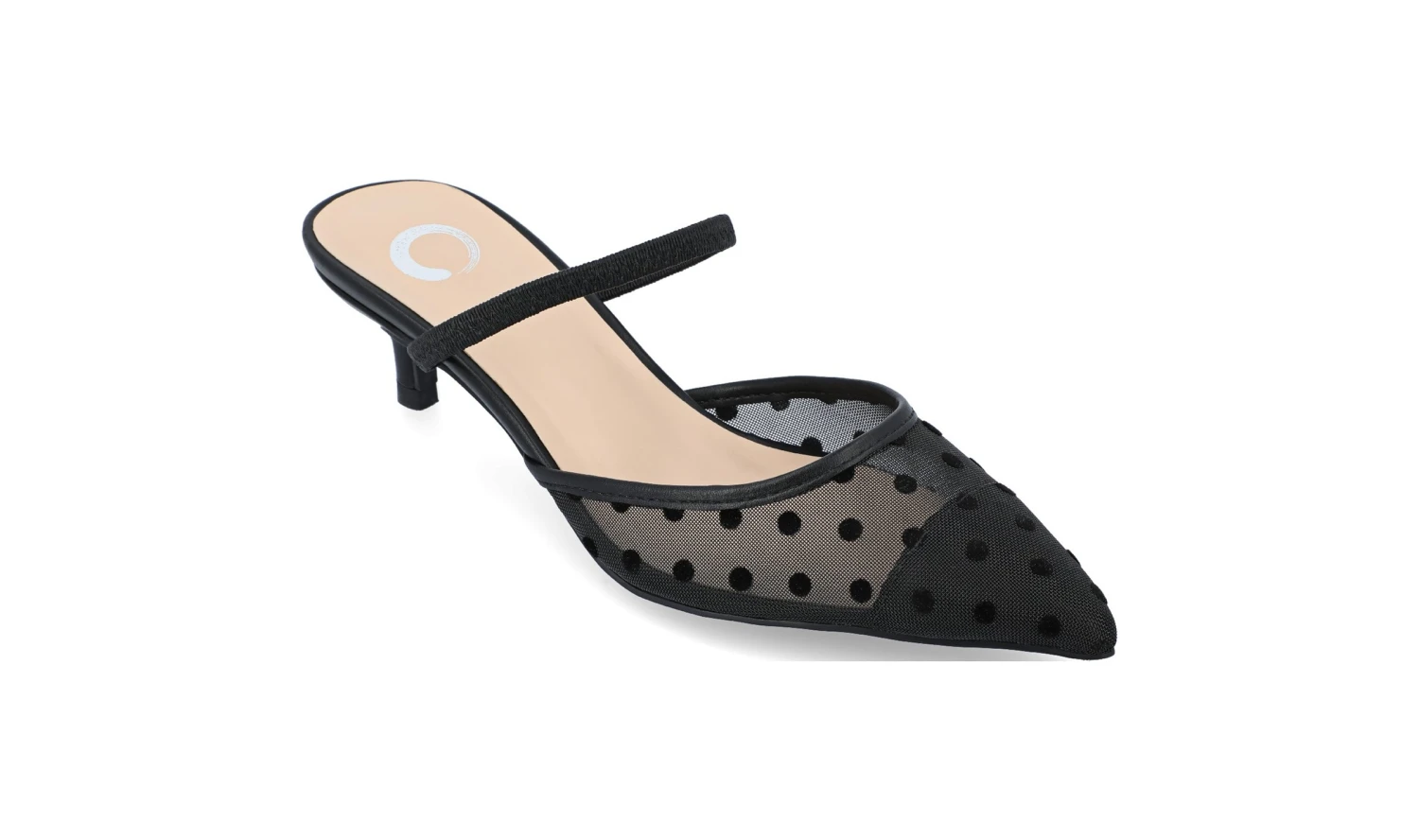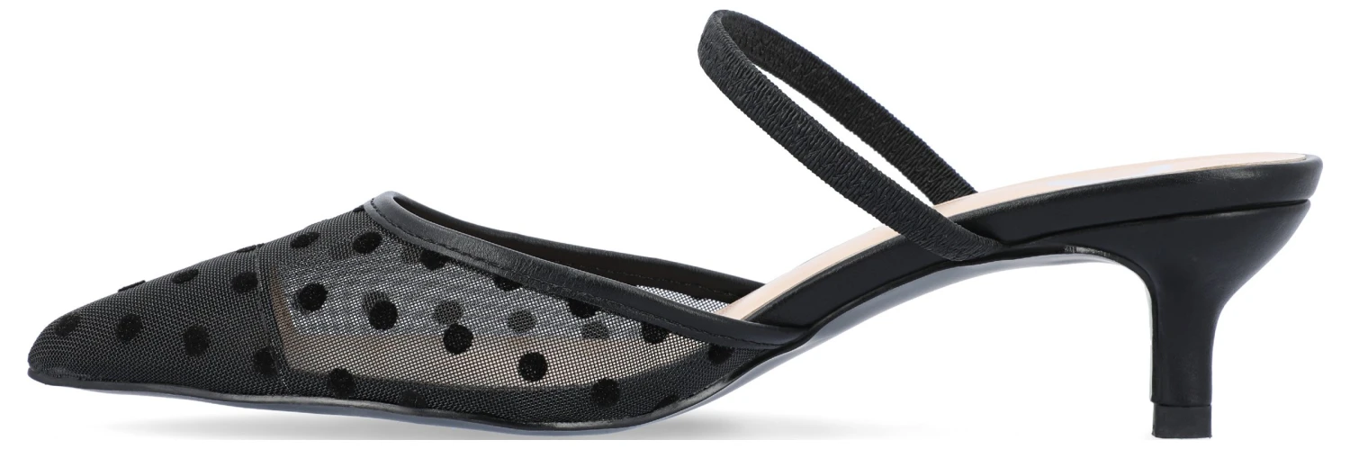 Proof that polka-dots are always in style: the Women’s Allana Mule by Journee Collection. This vintage kitten heel is topped with a cap-toe and mesh fabric uppers with a polka dot pattern throughout. A stretchable strap and padded insole perfect this slip-on silhouette. At Journee Collection, our pump styles will let you go from a fun night out with the girls to kicking back and relaxing at the end of the night without any trouble.