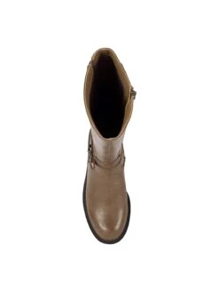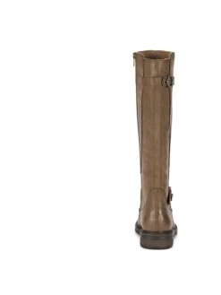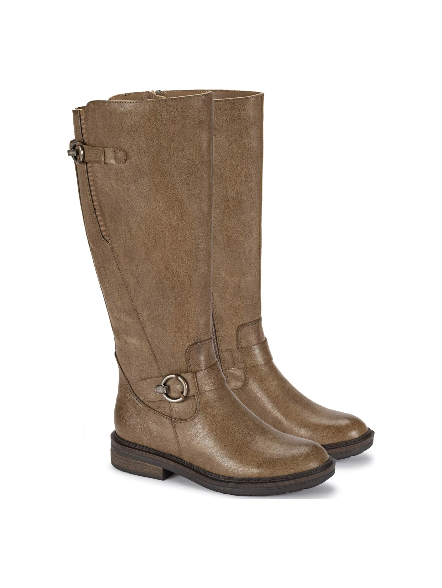 - Synthetic leather upper in a tall riding boot style with a round toe