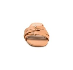 - Faux leather upper in a slide sandal style with an open toe.