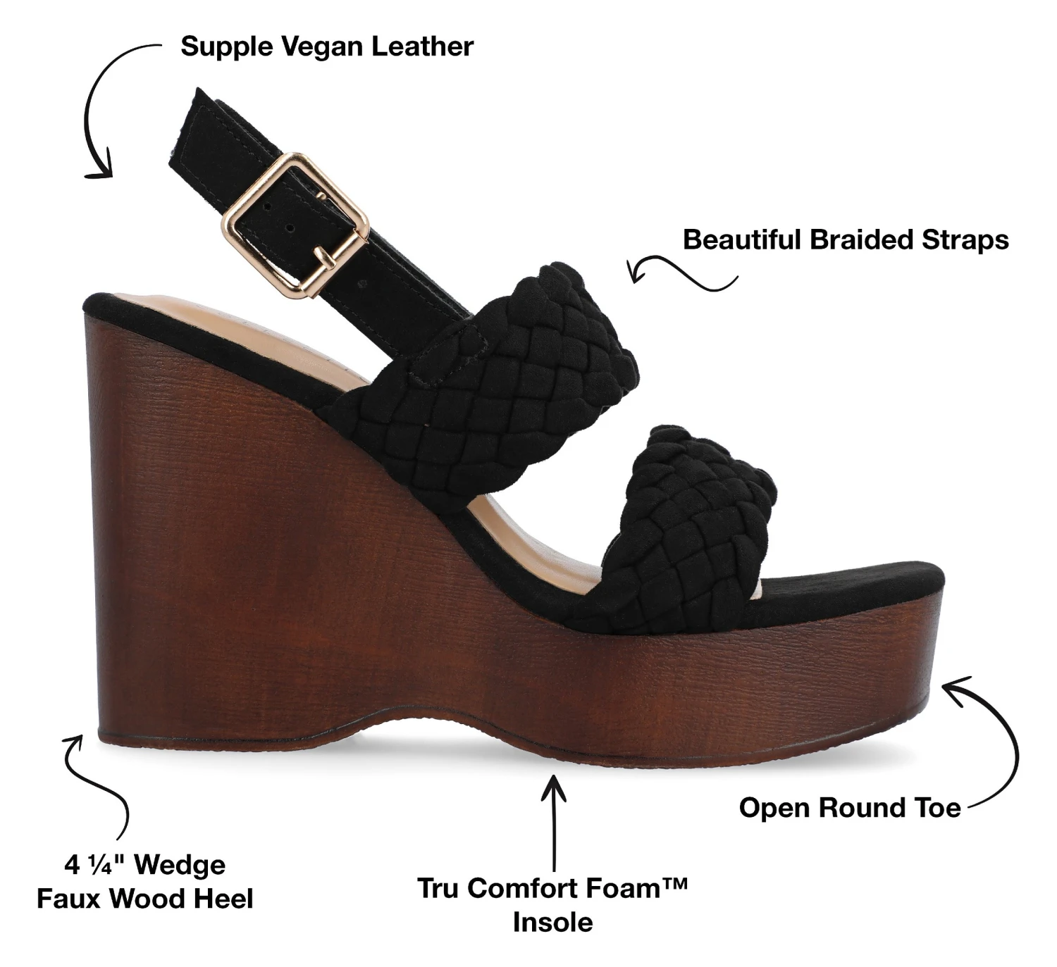 - Durable man-made outsole with 4.25″ wedge.