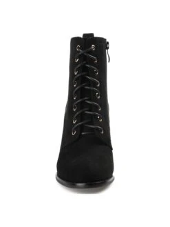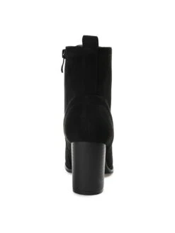 - Faux suede upper in a block-heel bootie style with a round toe.