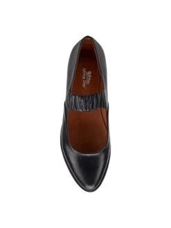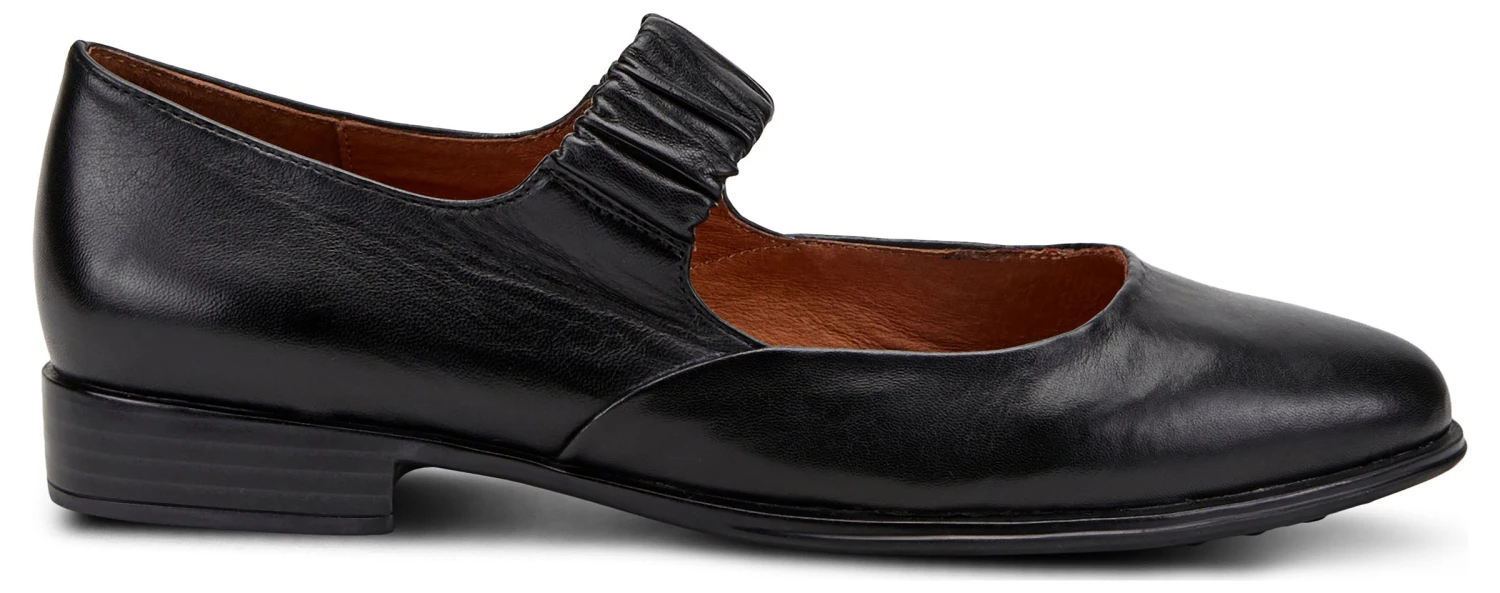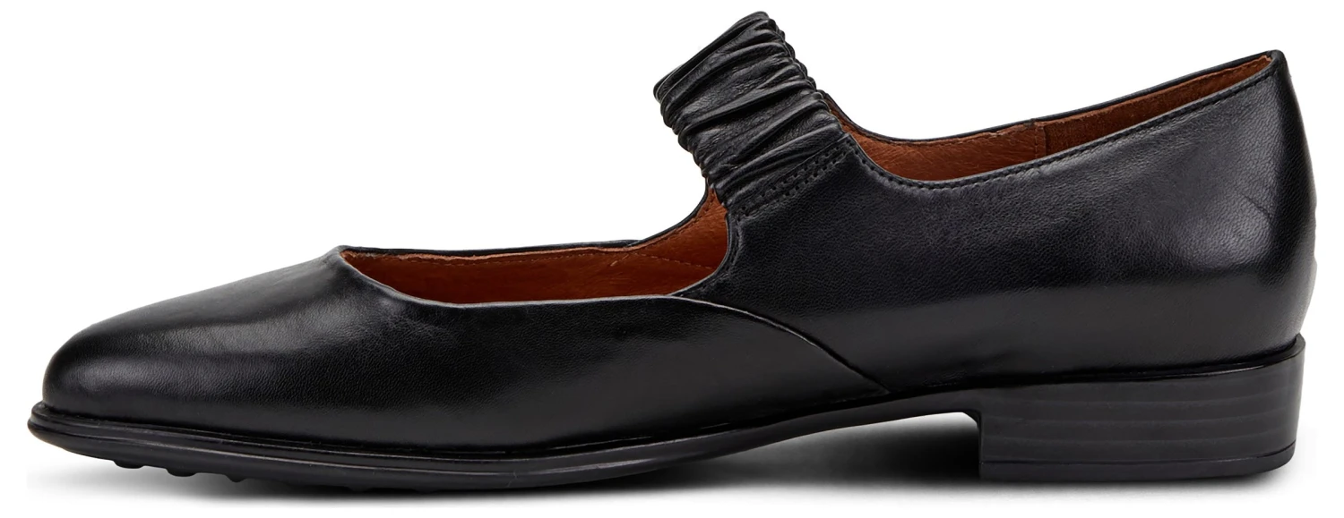 - Leather upper in a Mary Jane ballet flat style with an almond toe