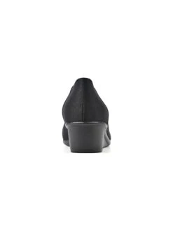 - Fabric or faux leather upper in a wedge slip on with an almond toe