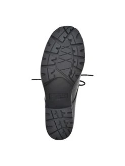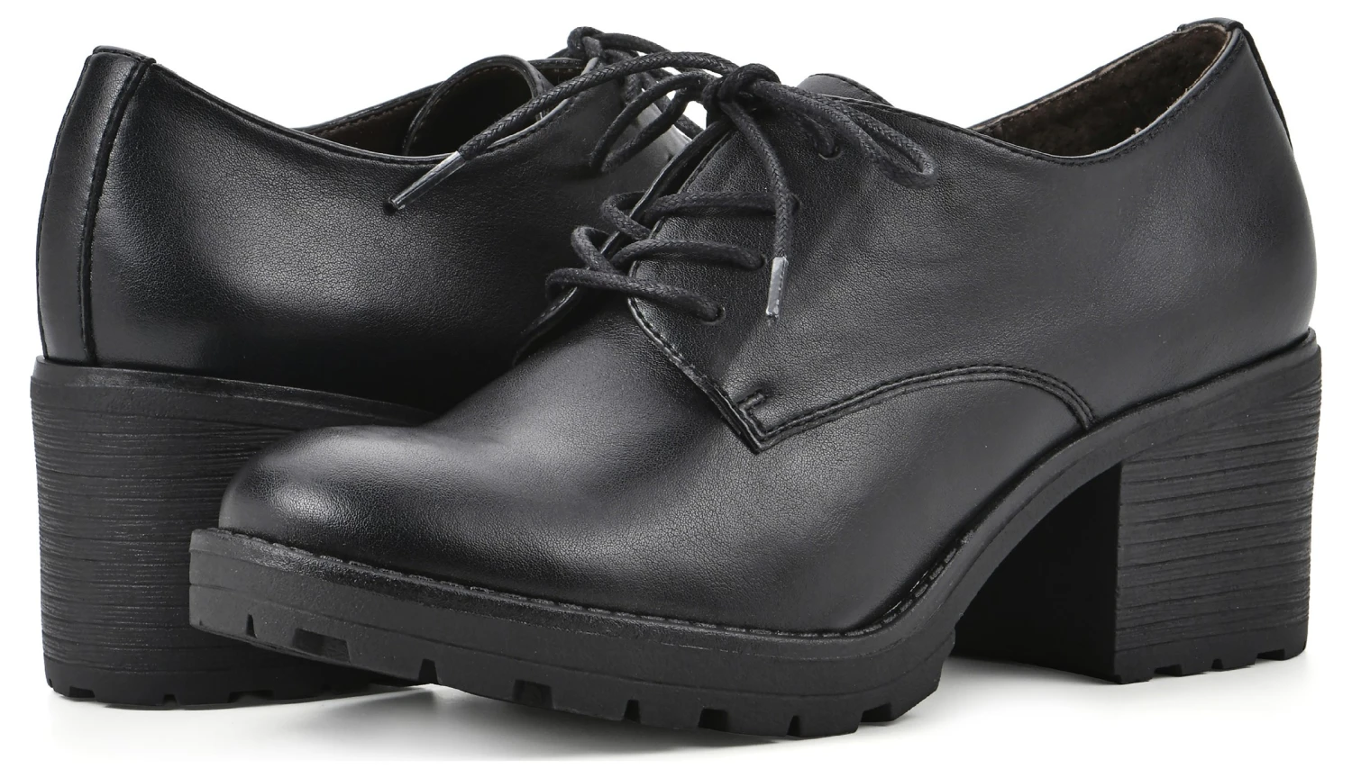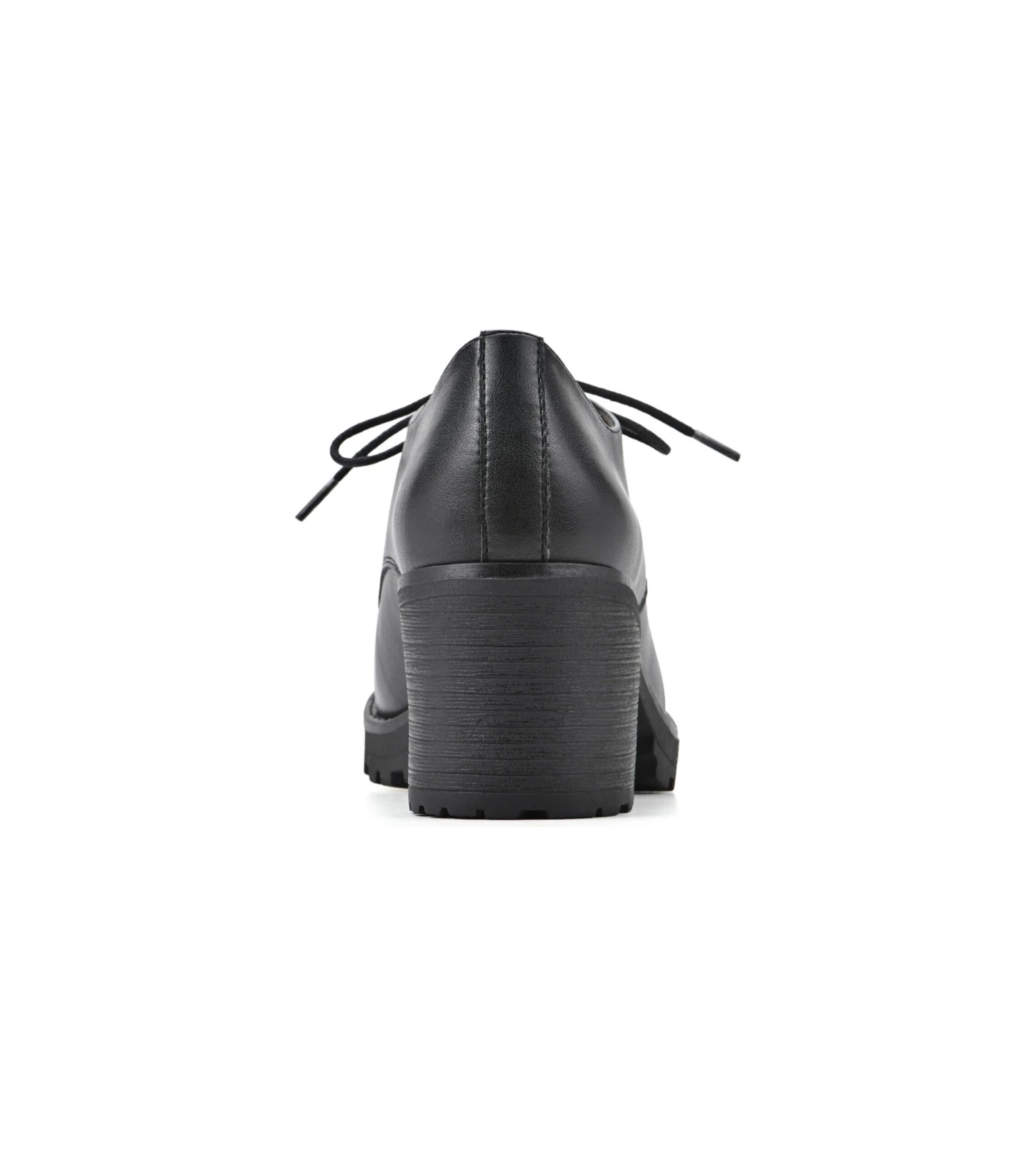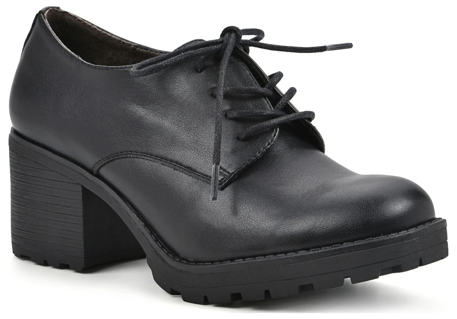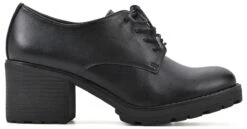 - Faux leather upper in a lace up heel style with a round toe