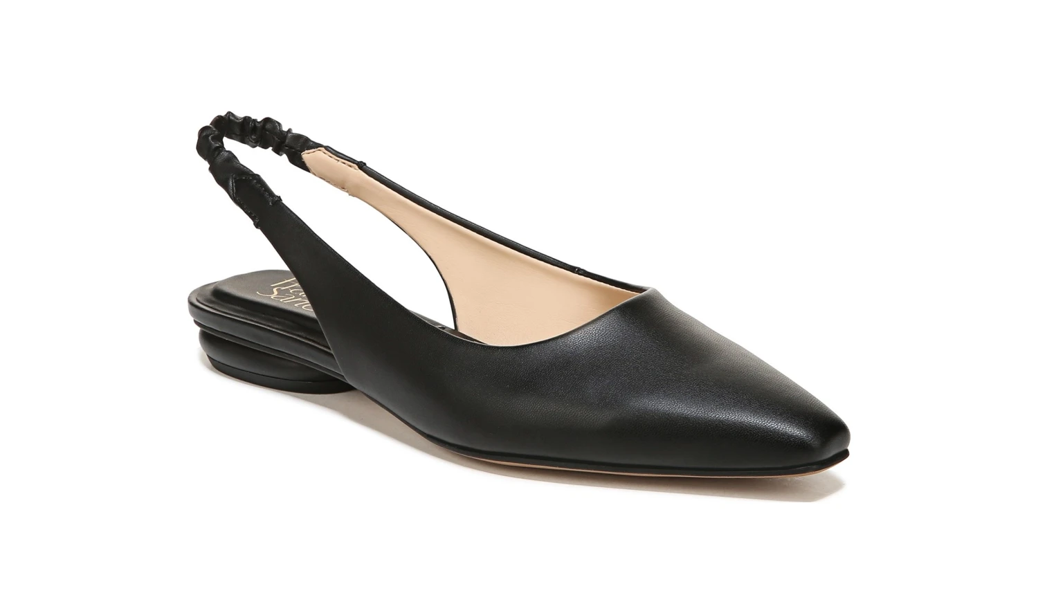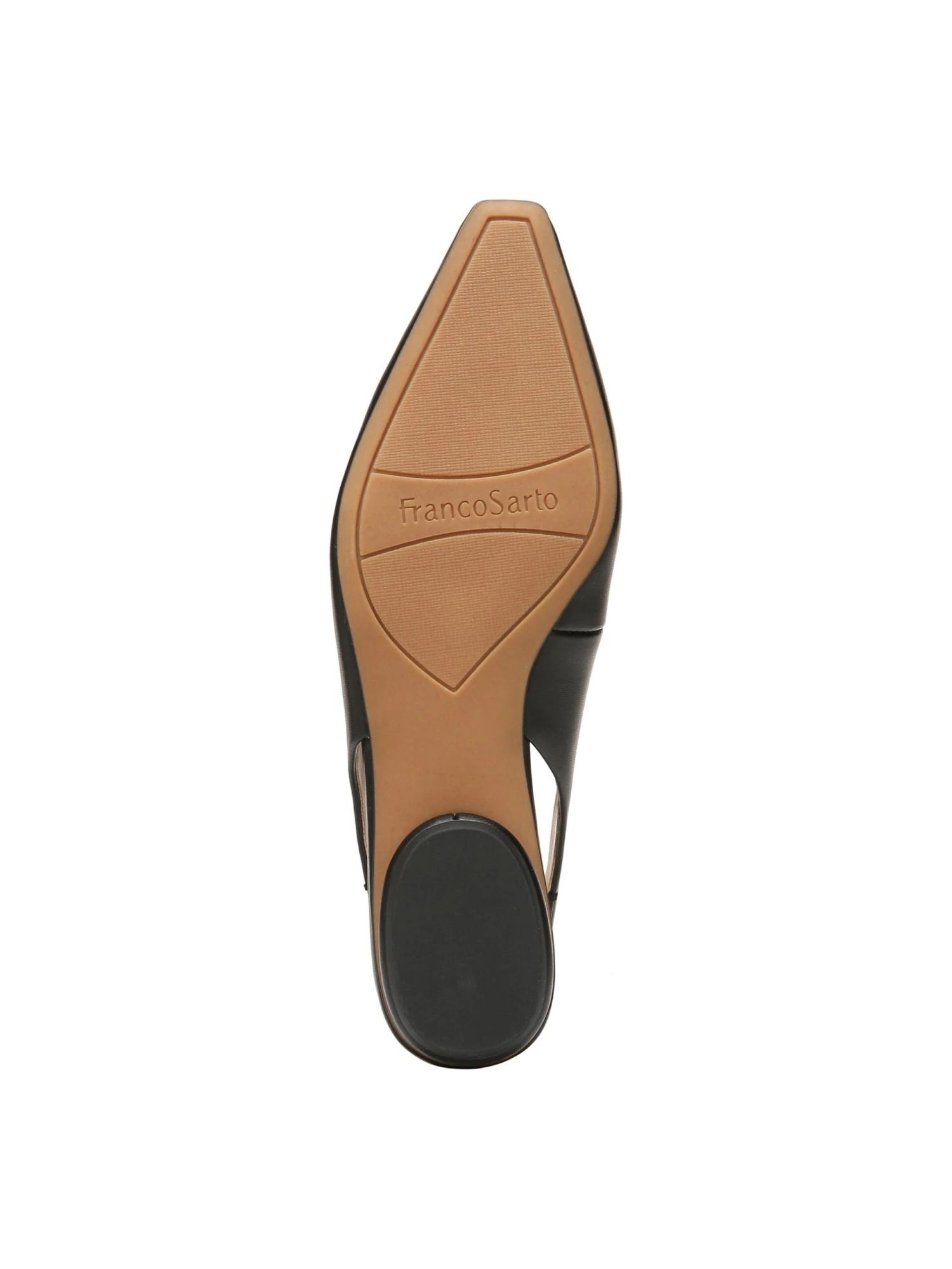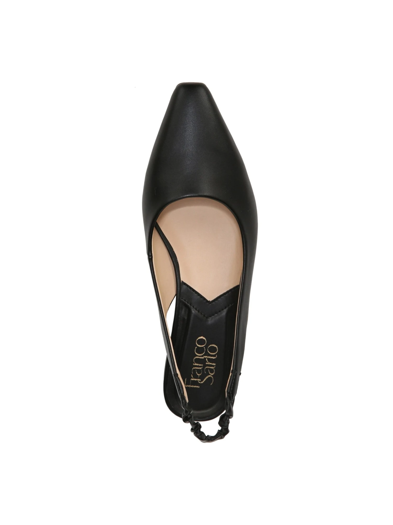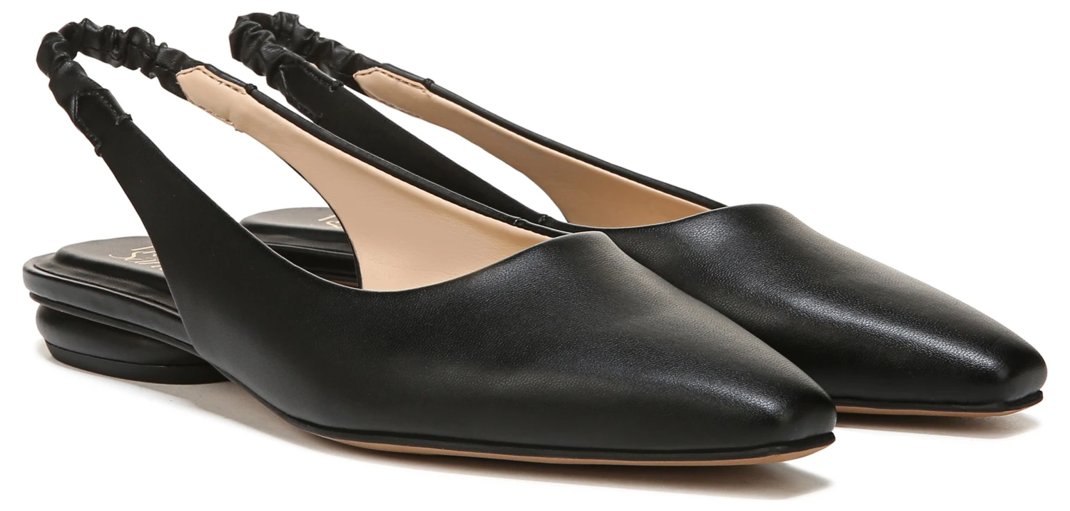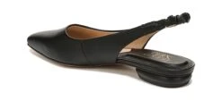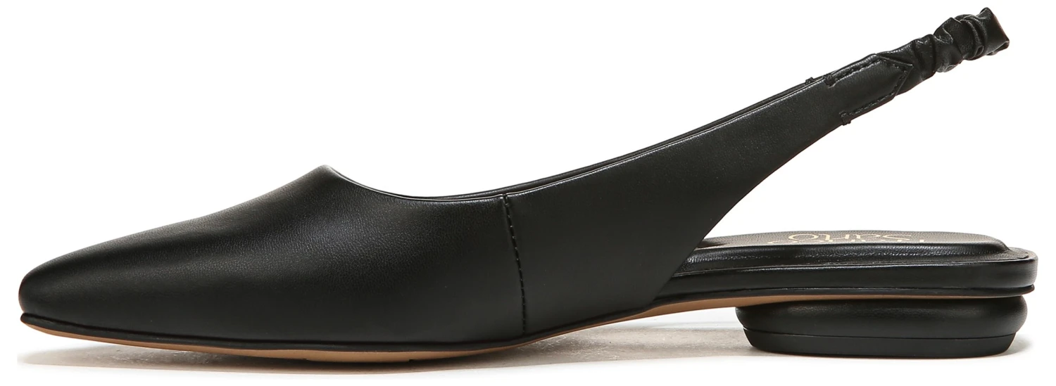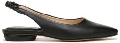 - Synthetic leather upper in a sling back shoe style with an almond toe