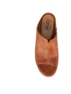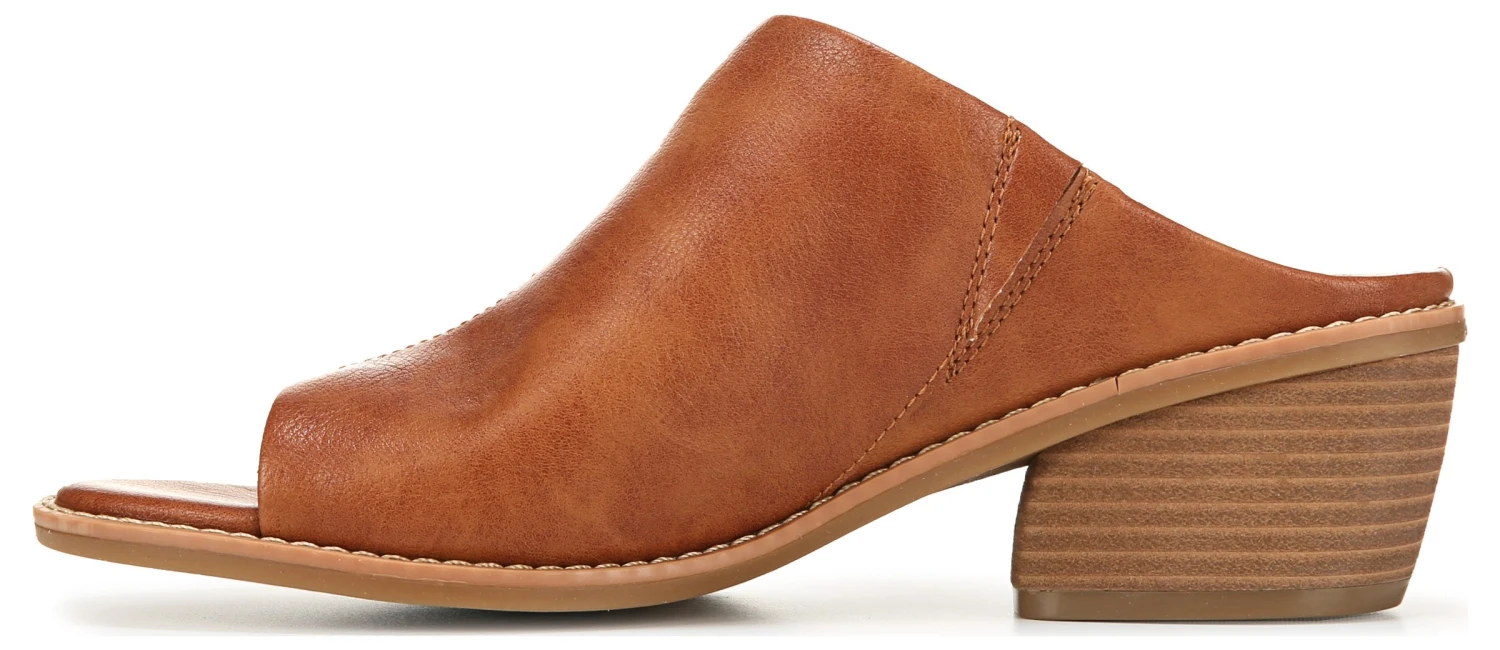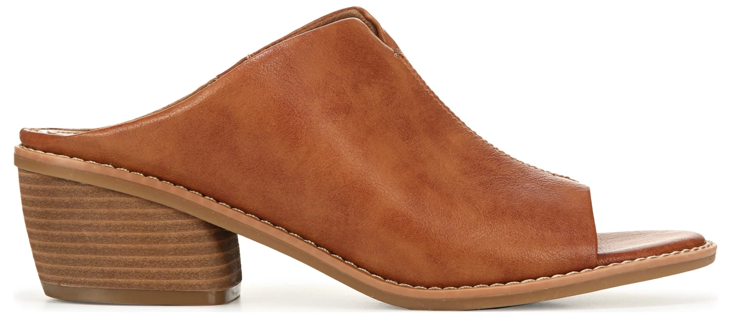 - Faux leather upper in a block heel slide sandal style with a peep toe