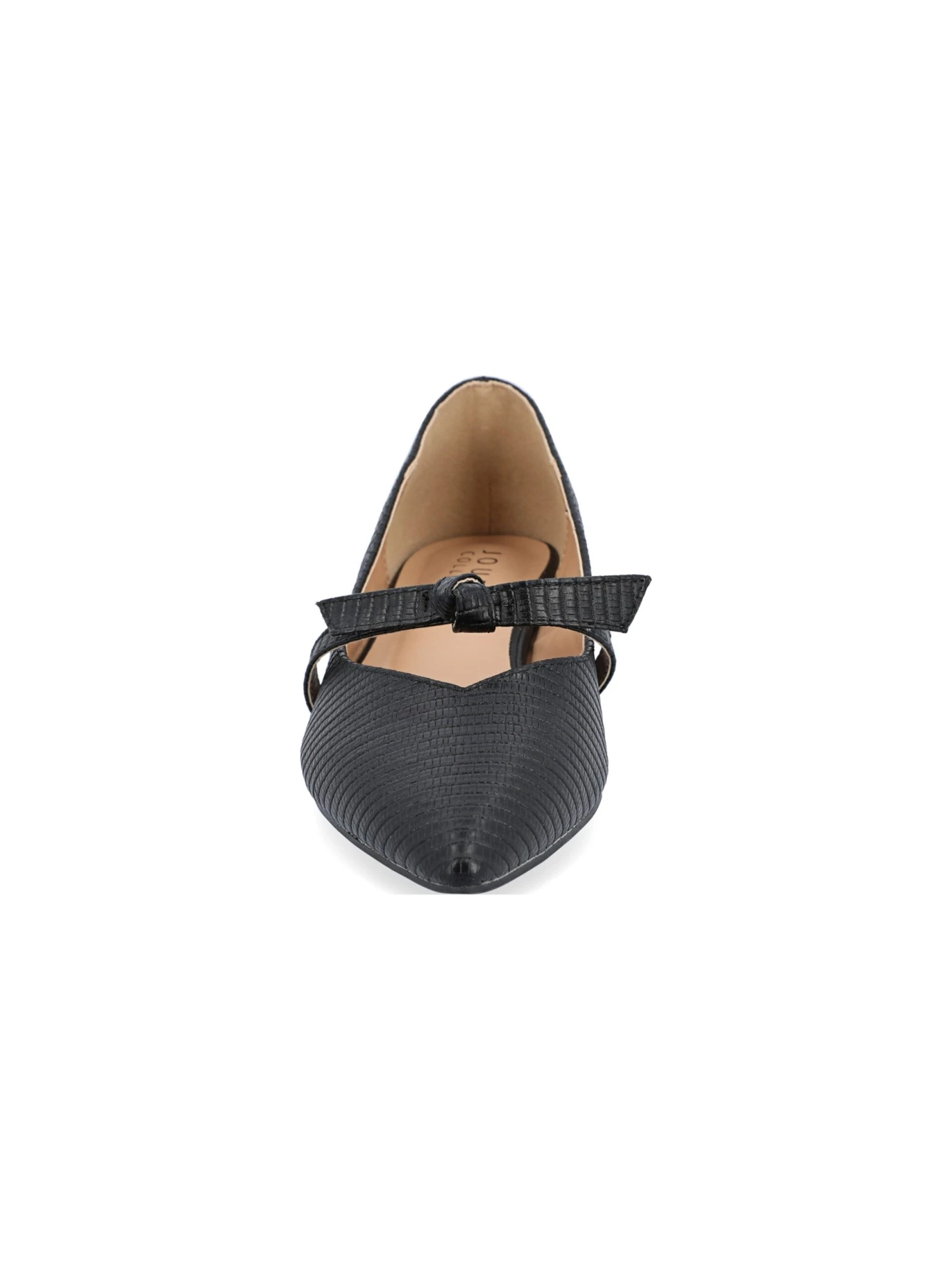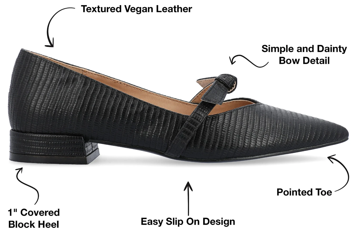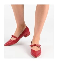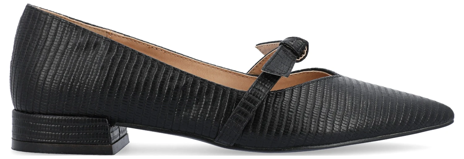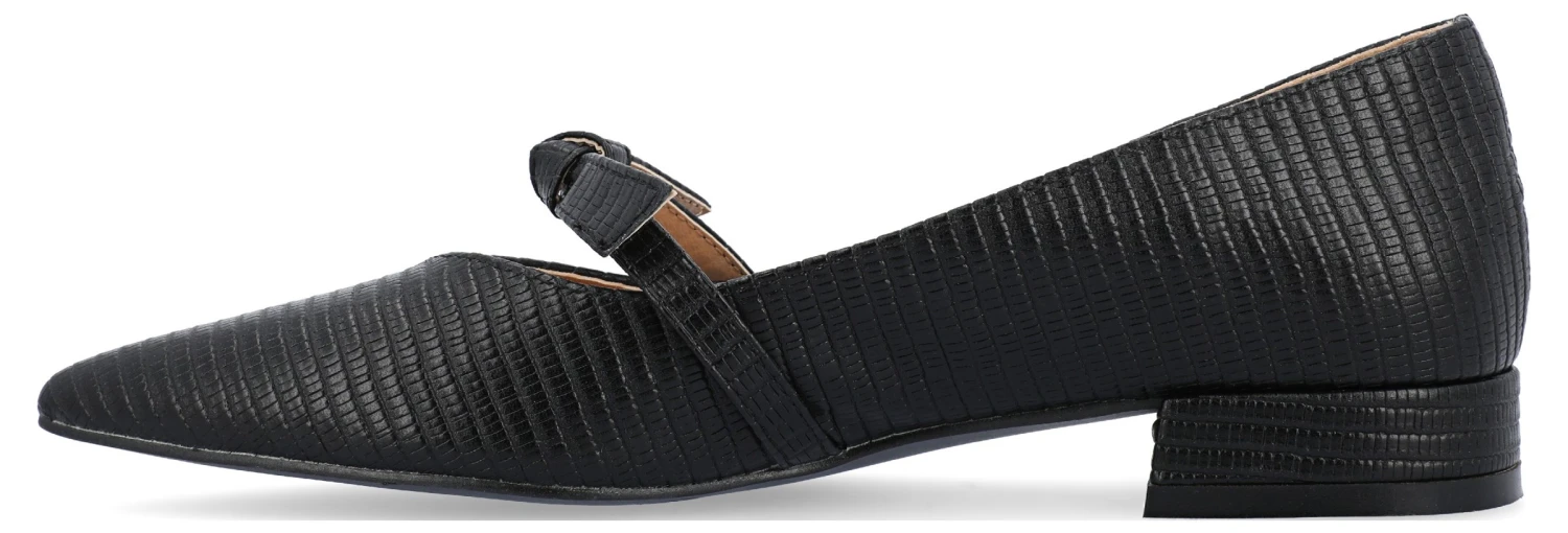 - Vegan leather upper in a mary jane style flat with a pointed toe