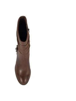 - Synthetic upper in a block heel boot style with a pointed toe