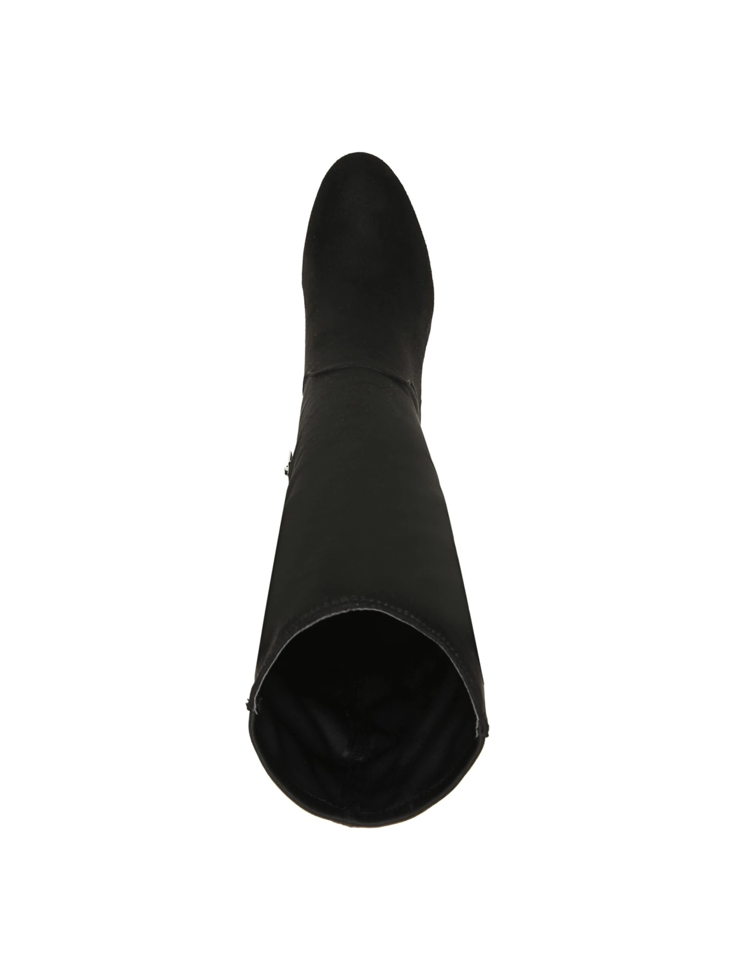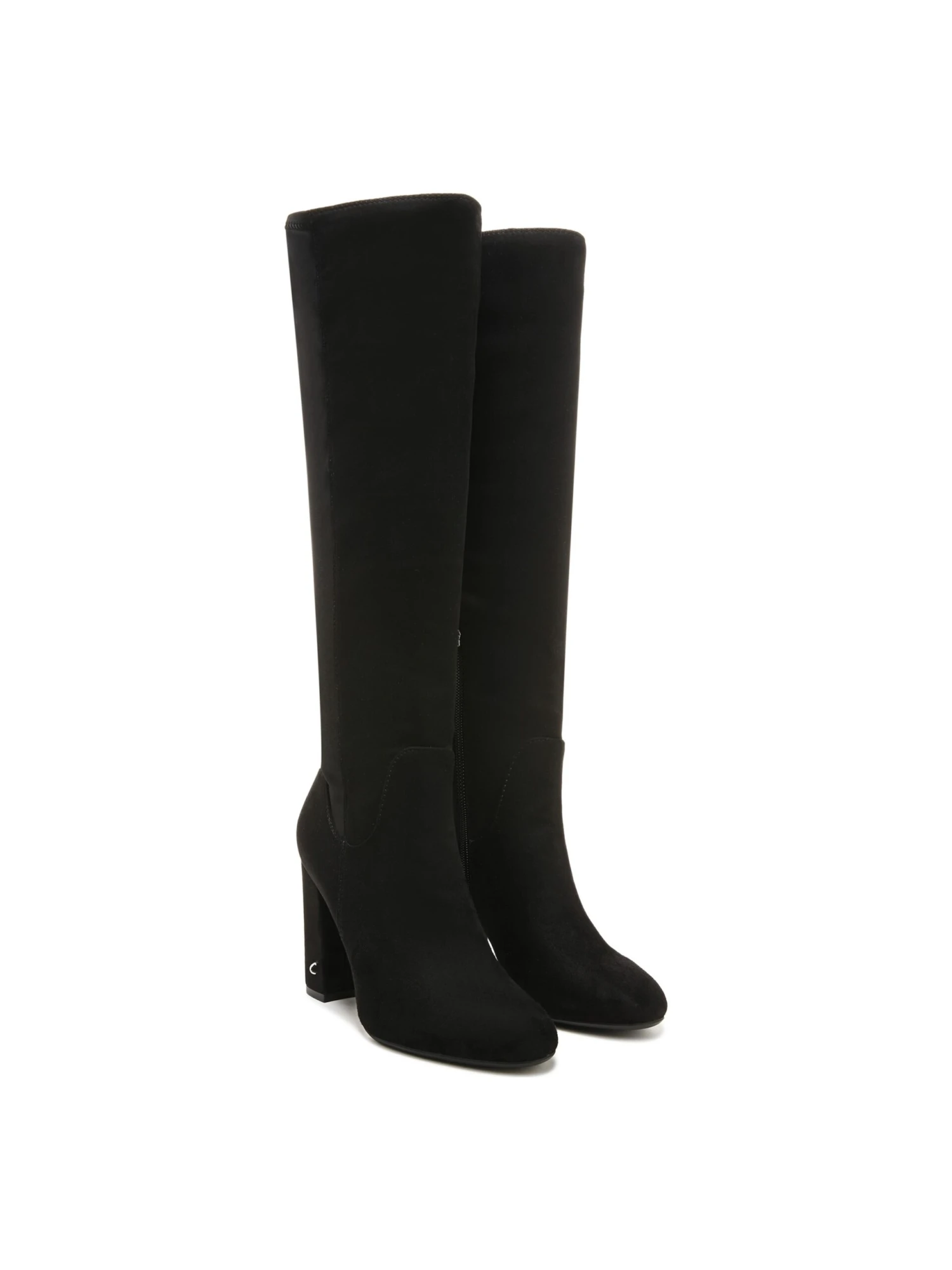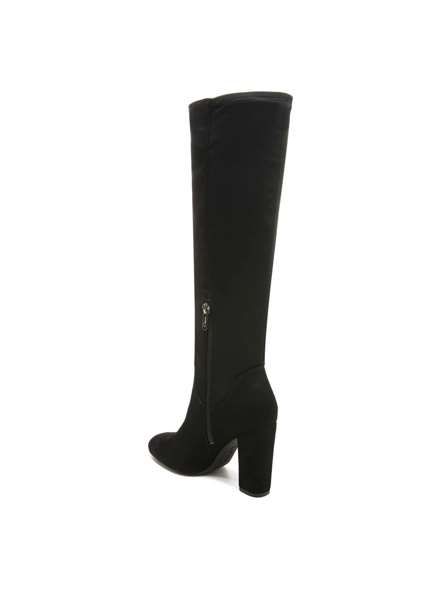 - Stretch upper in a block-heel knee-high boot style with a round toe