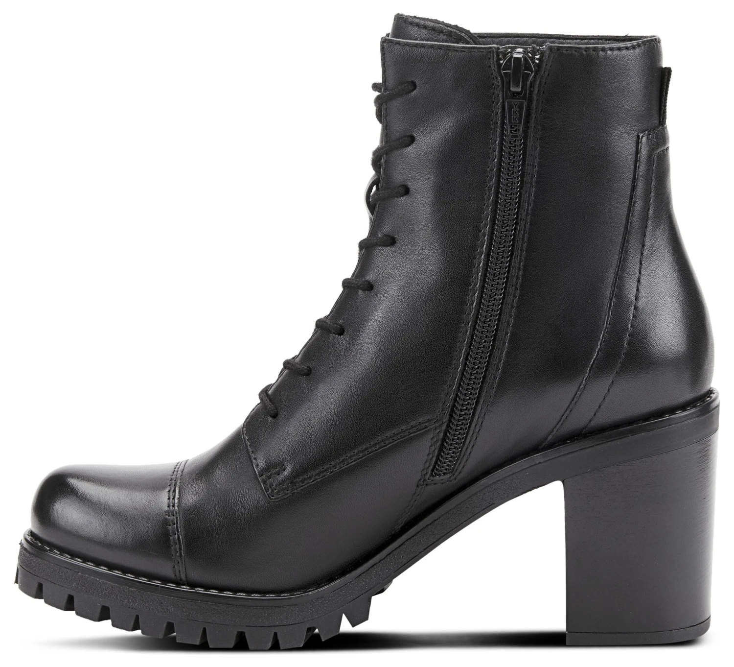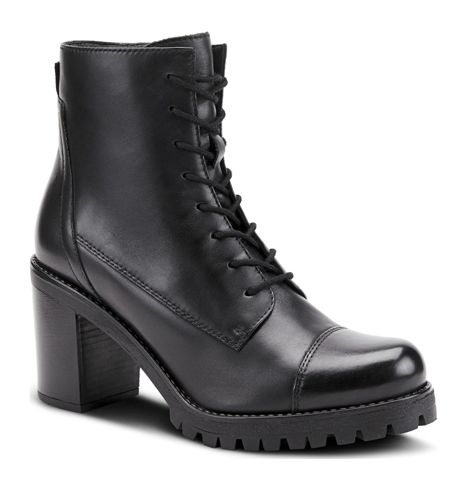 - Leather upper in a block-heel bootie style with a cap toe