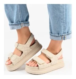 - Vegan leather upper in a platform sandal with an open round toe