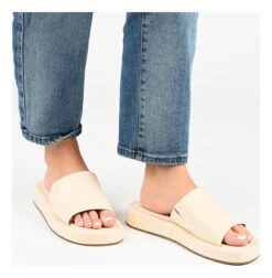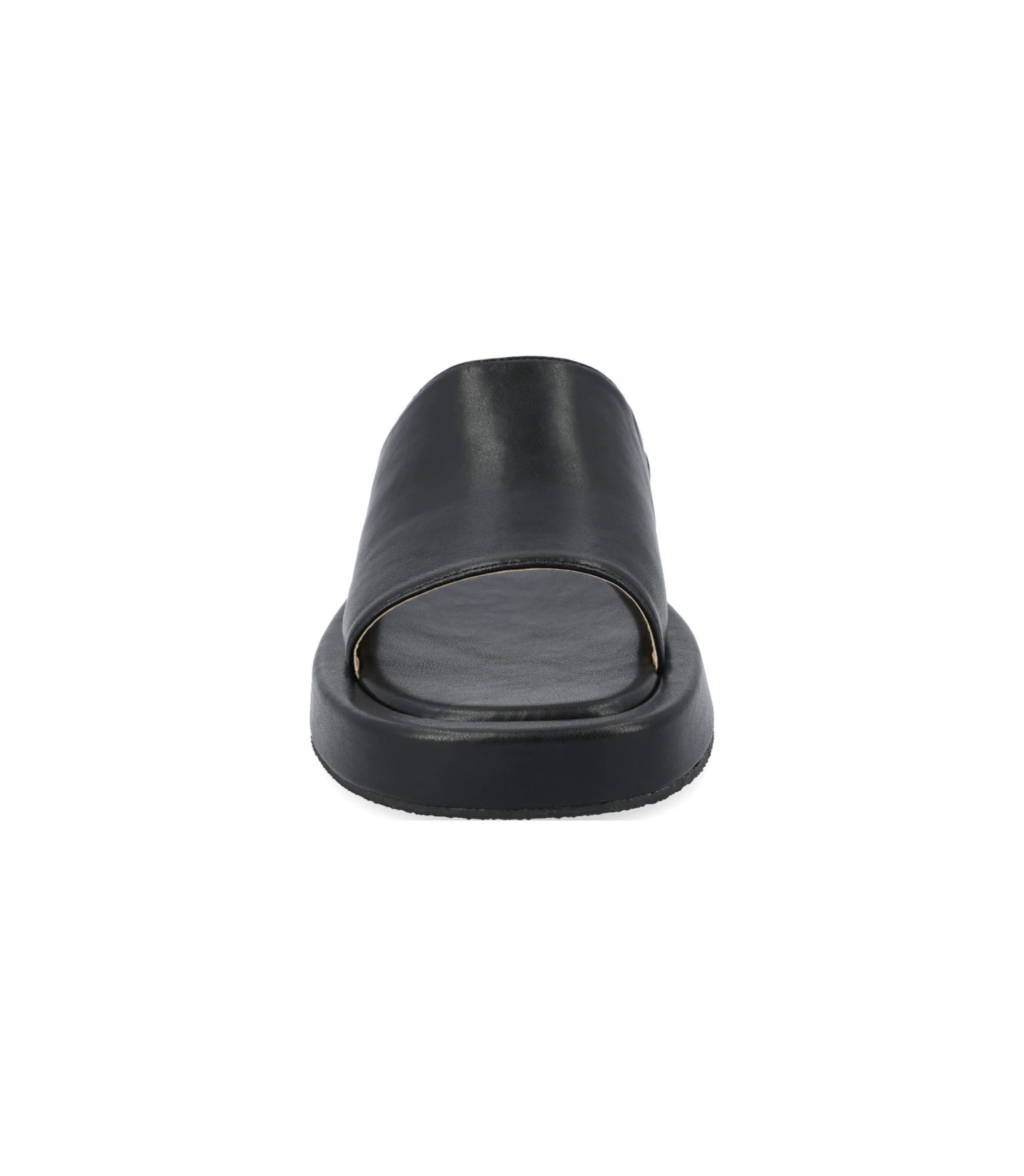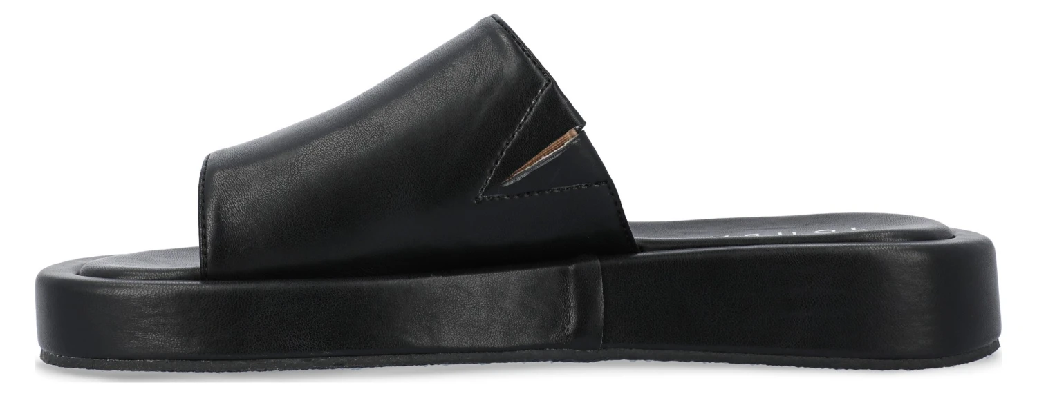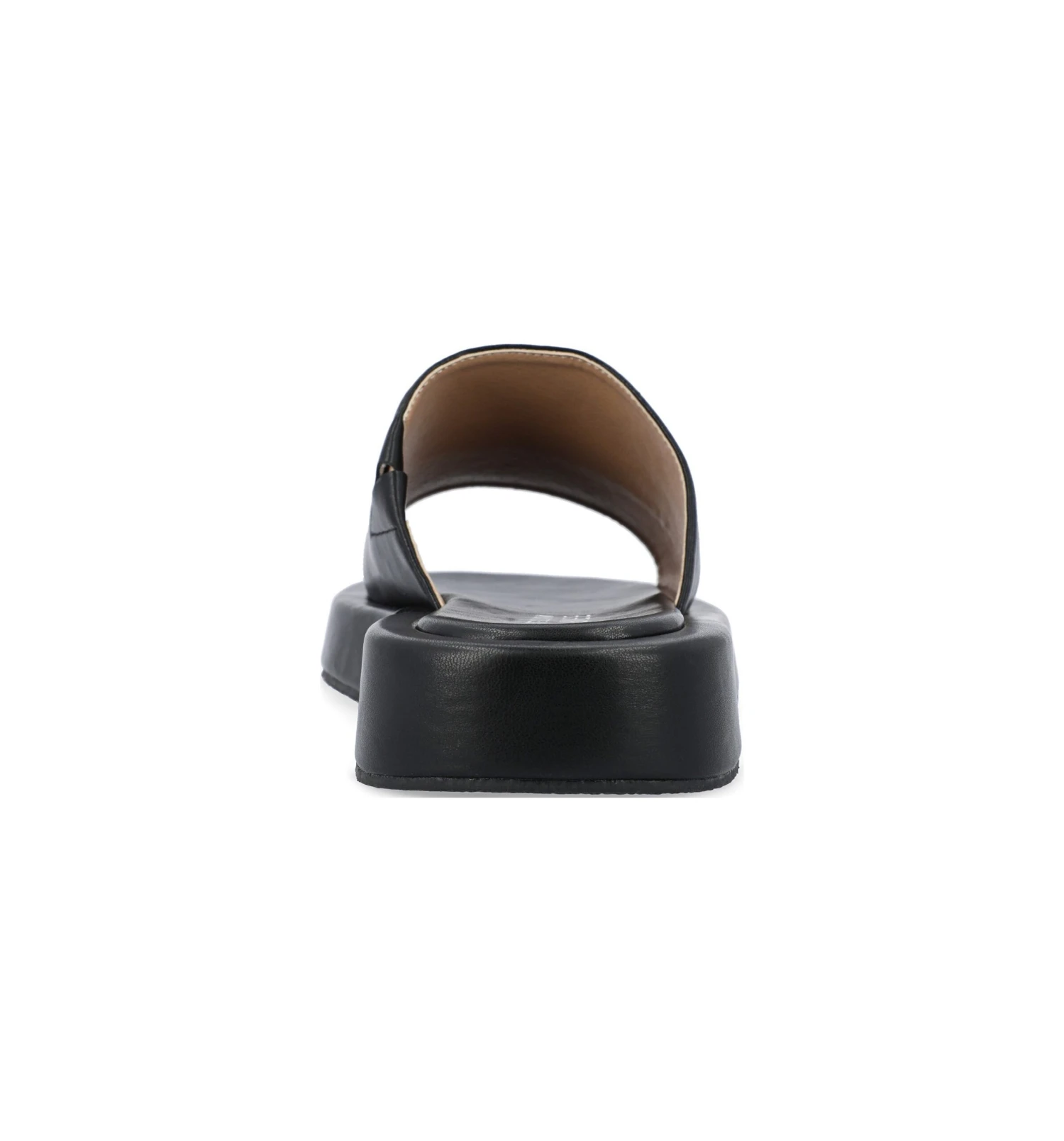 - Vegan leather upper in a slide style platform sandal with an open toe