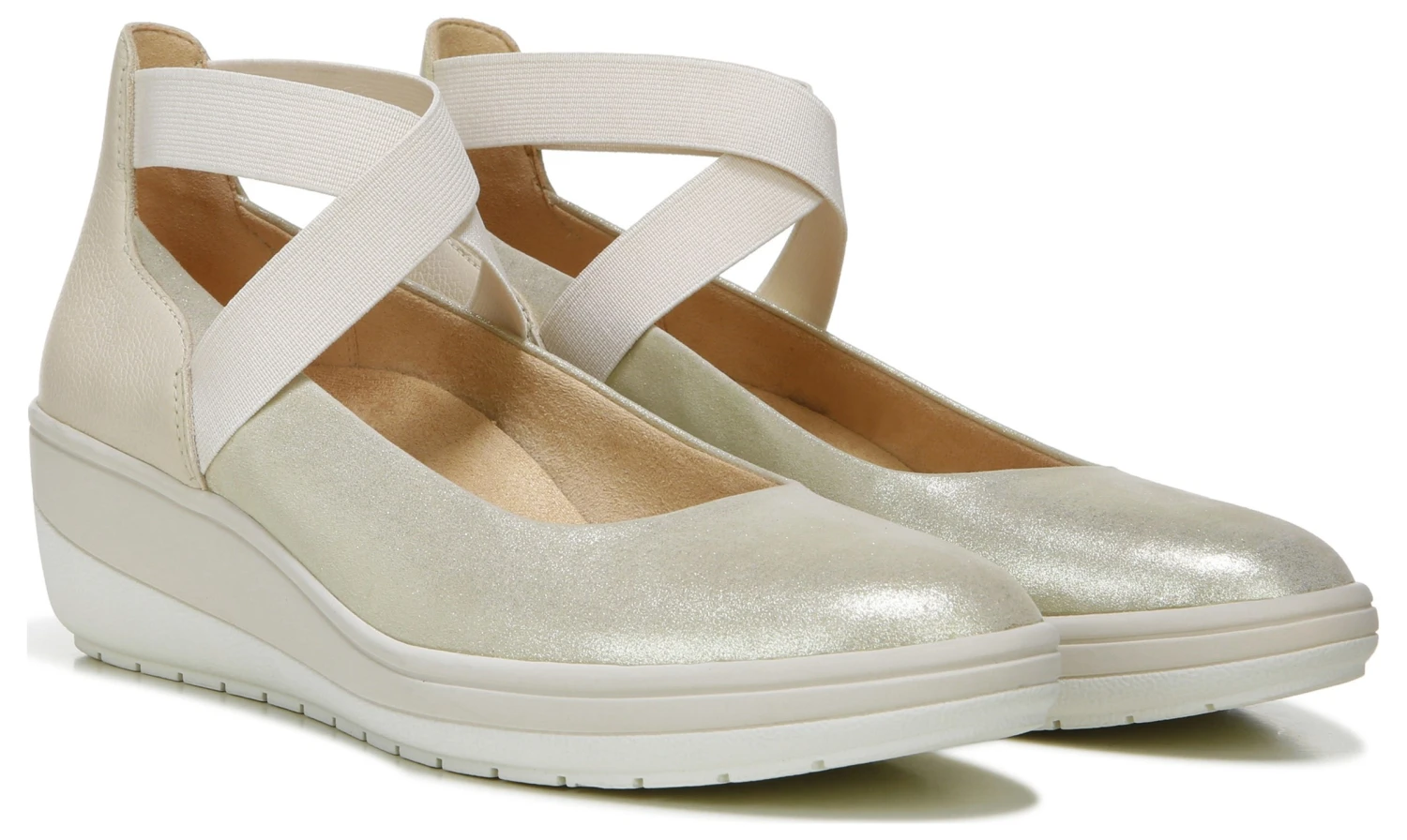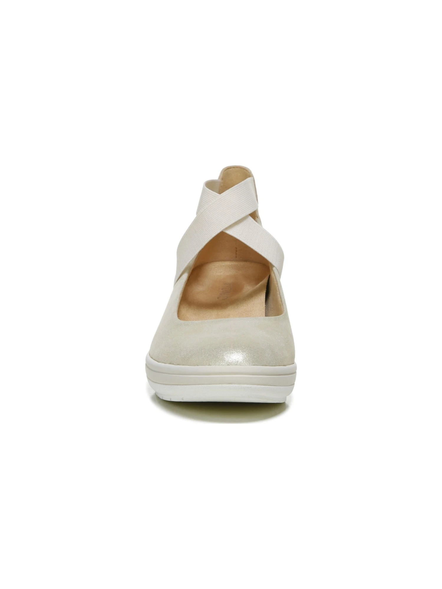 - Suede or nubuck upper in a wedge slip on style with an almond toe.