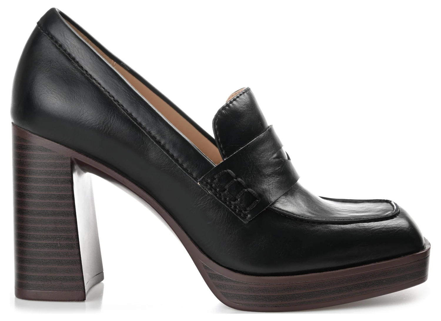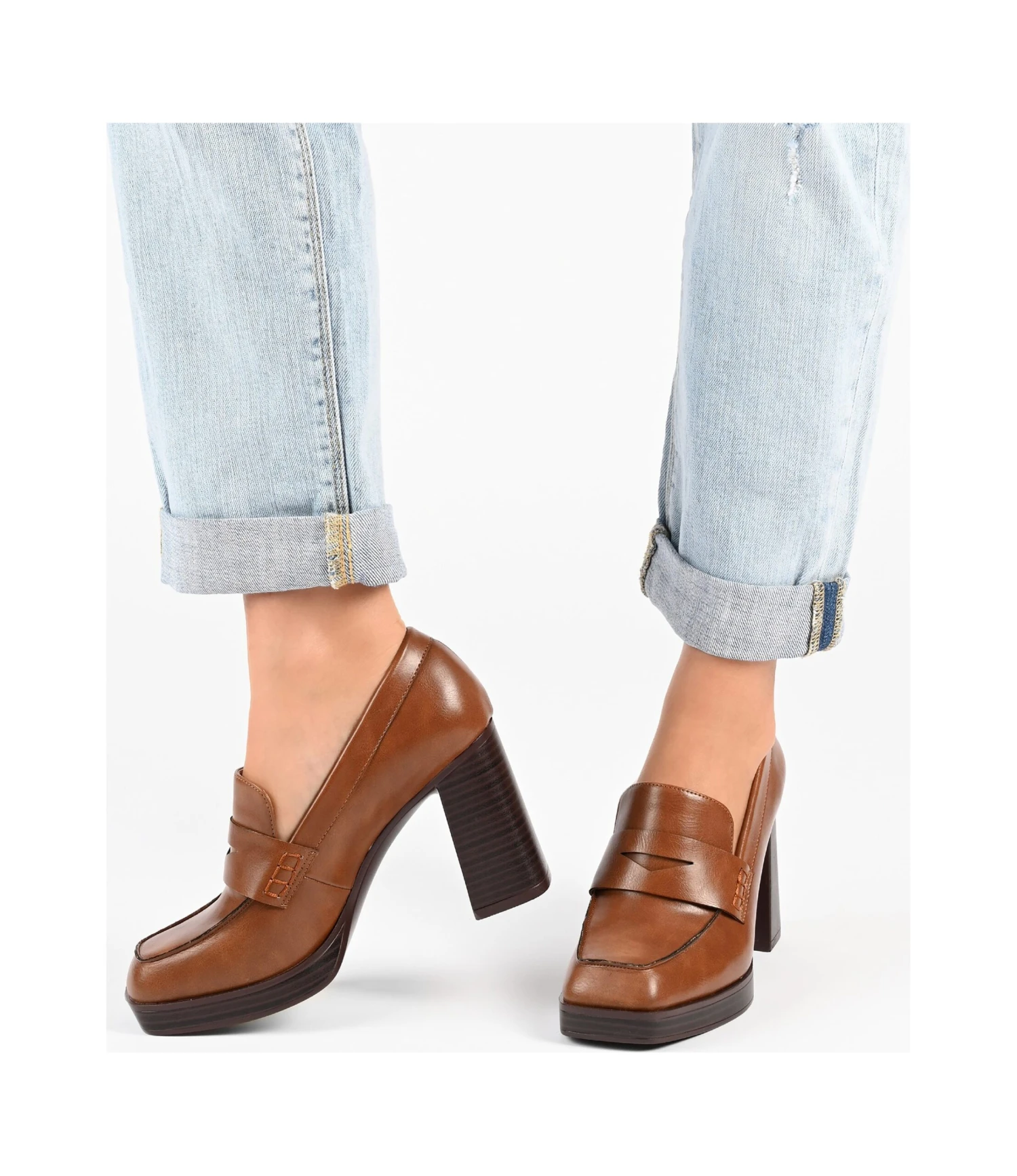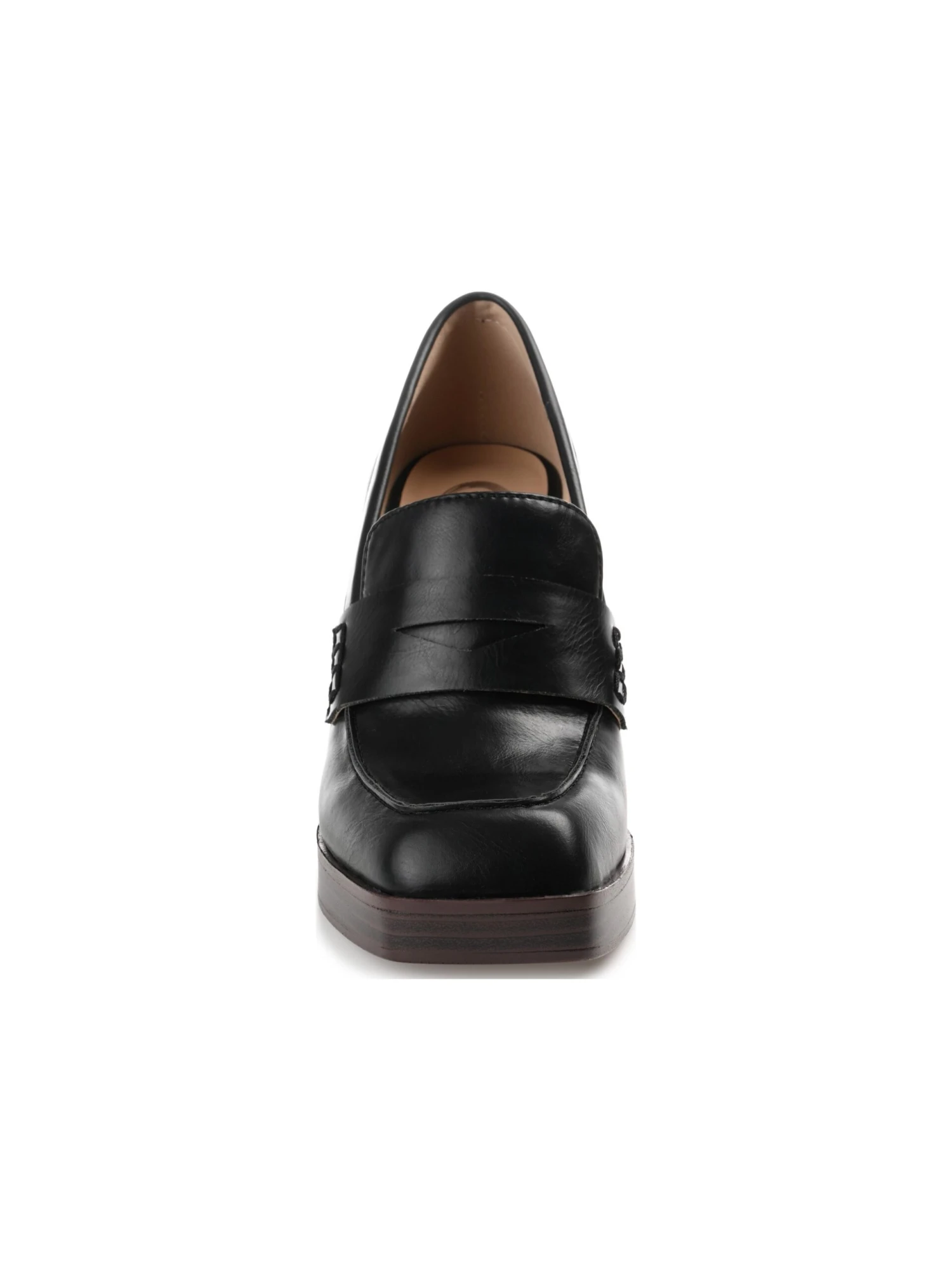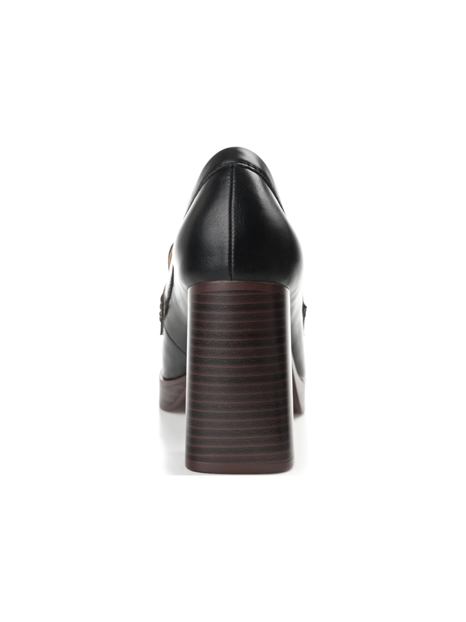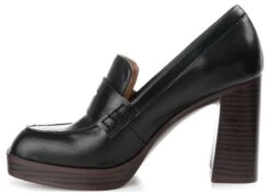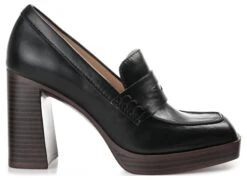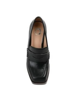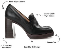 - Vegan leather upper in a block heel loafer style with a round toe