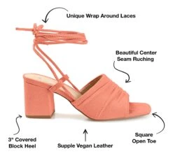 - Vegan leather upper in a block heel sandal style with an open toe.