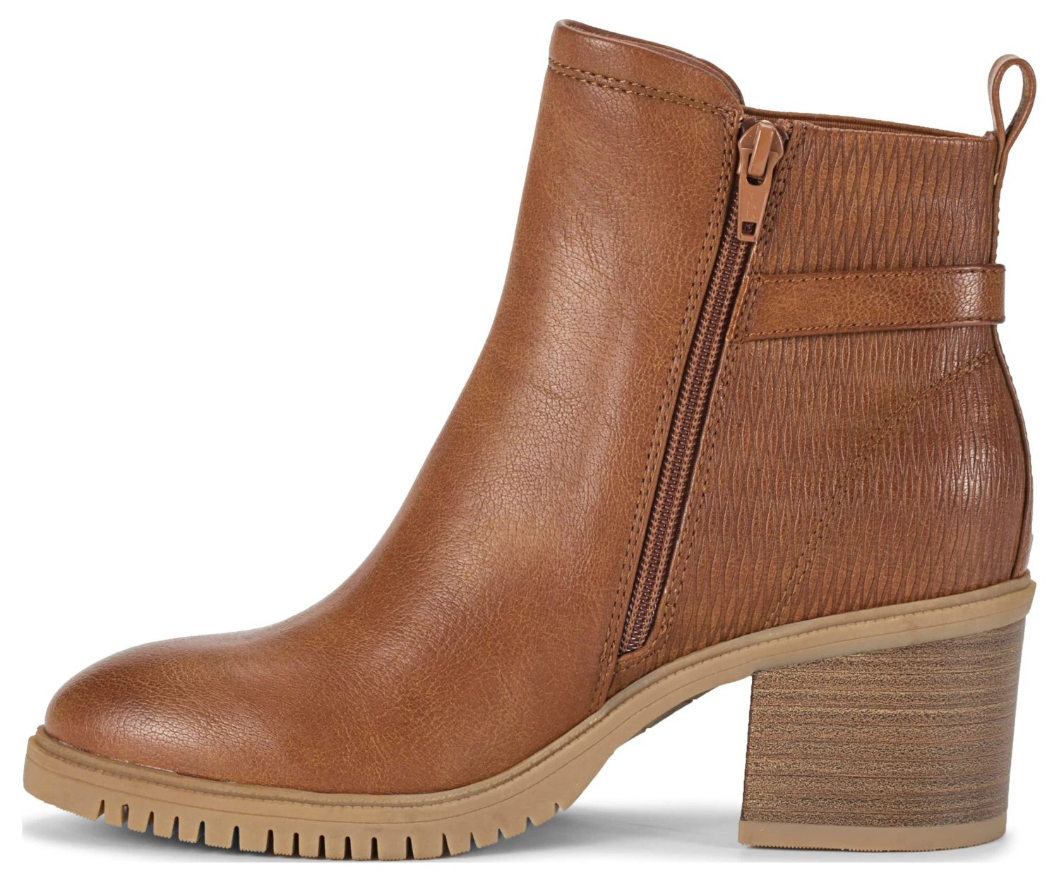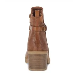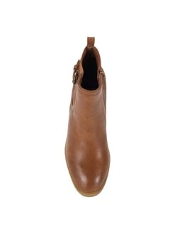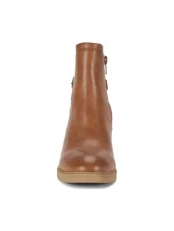 - Faux leather upper in a block heel ankle boot style with a round toe