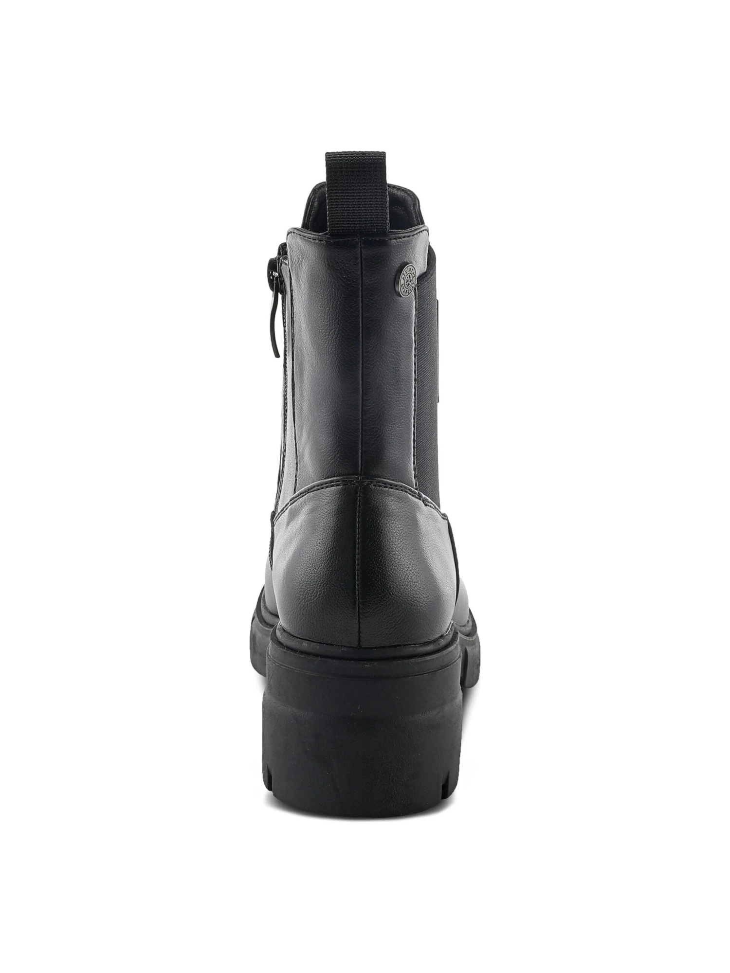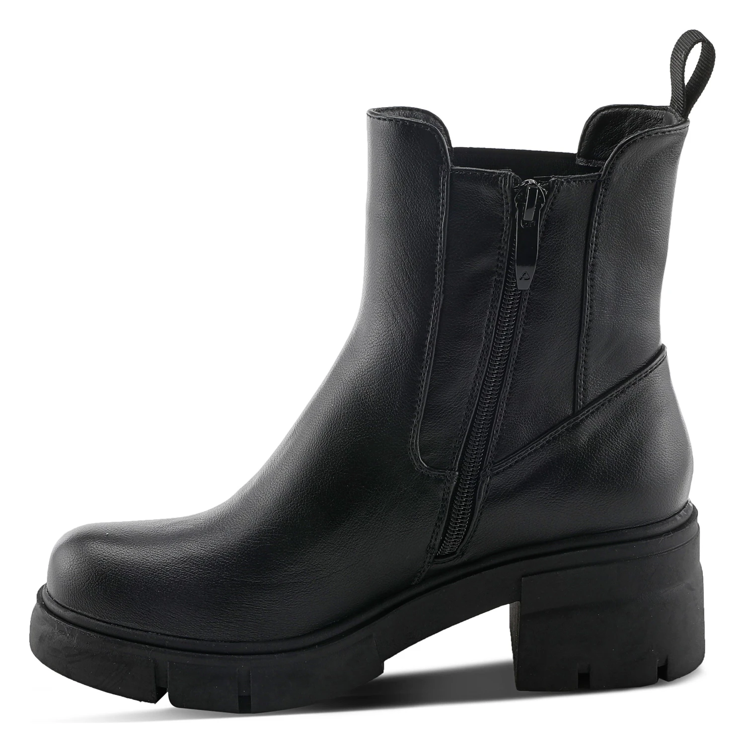 - Faux leather upper in a block heel bootie style with a round toe