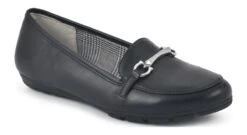 - Faux-leather, fabric, or microsuede upper in a loafer style with an almond toe