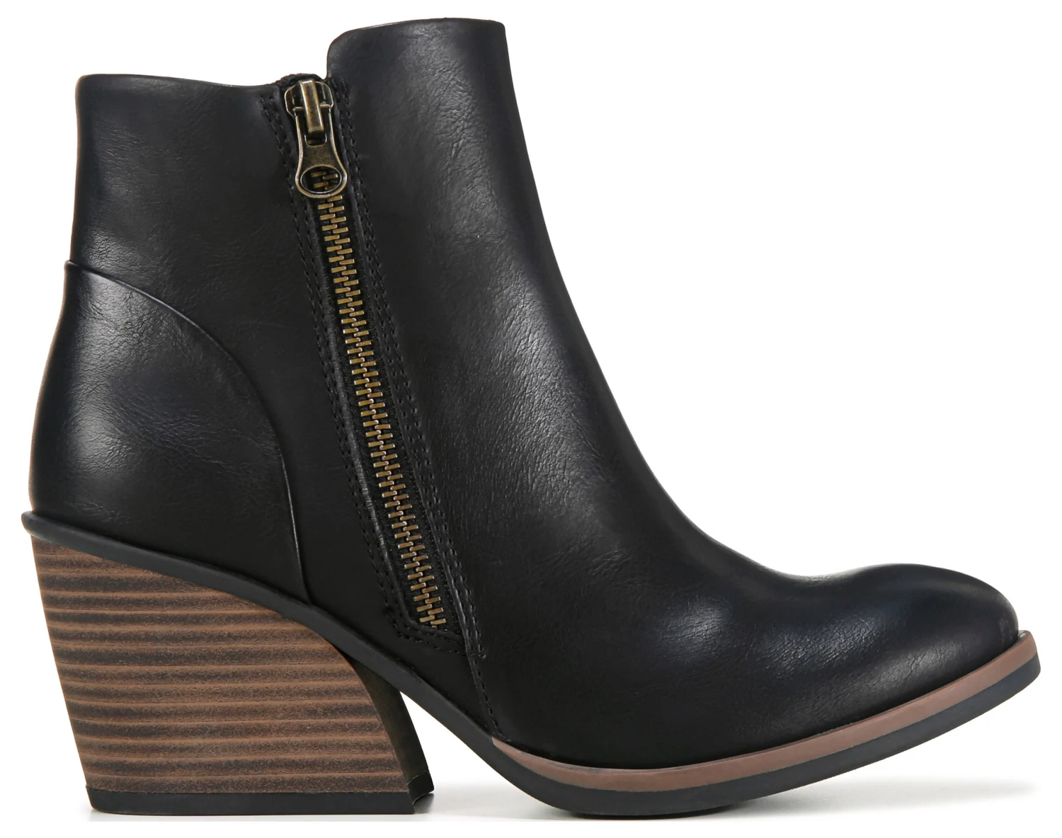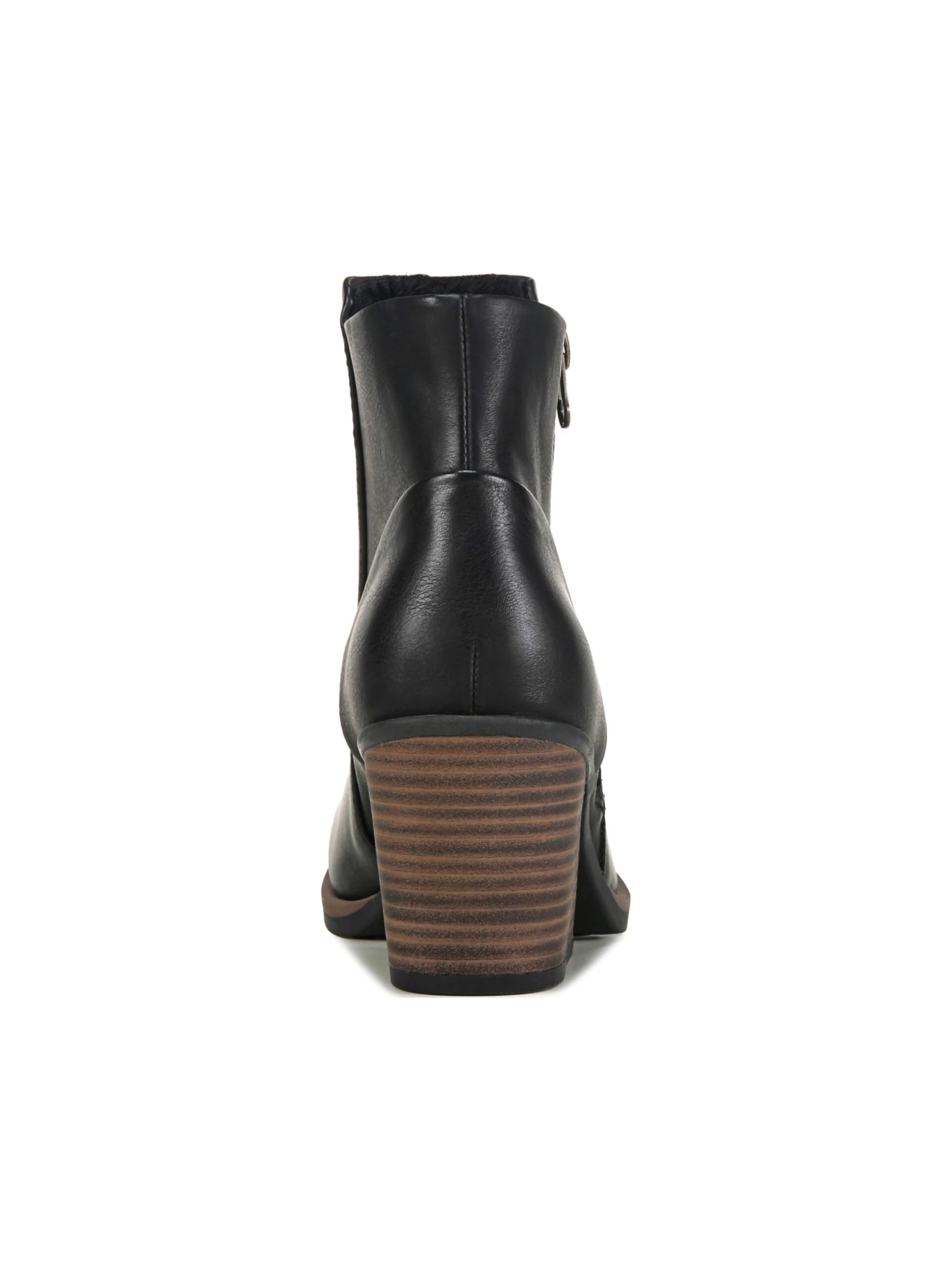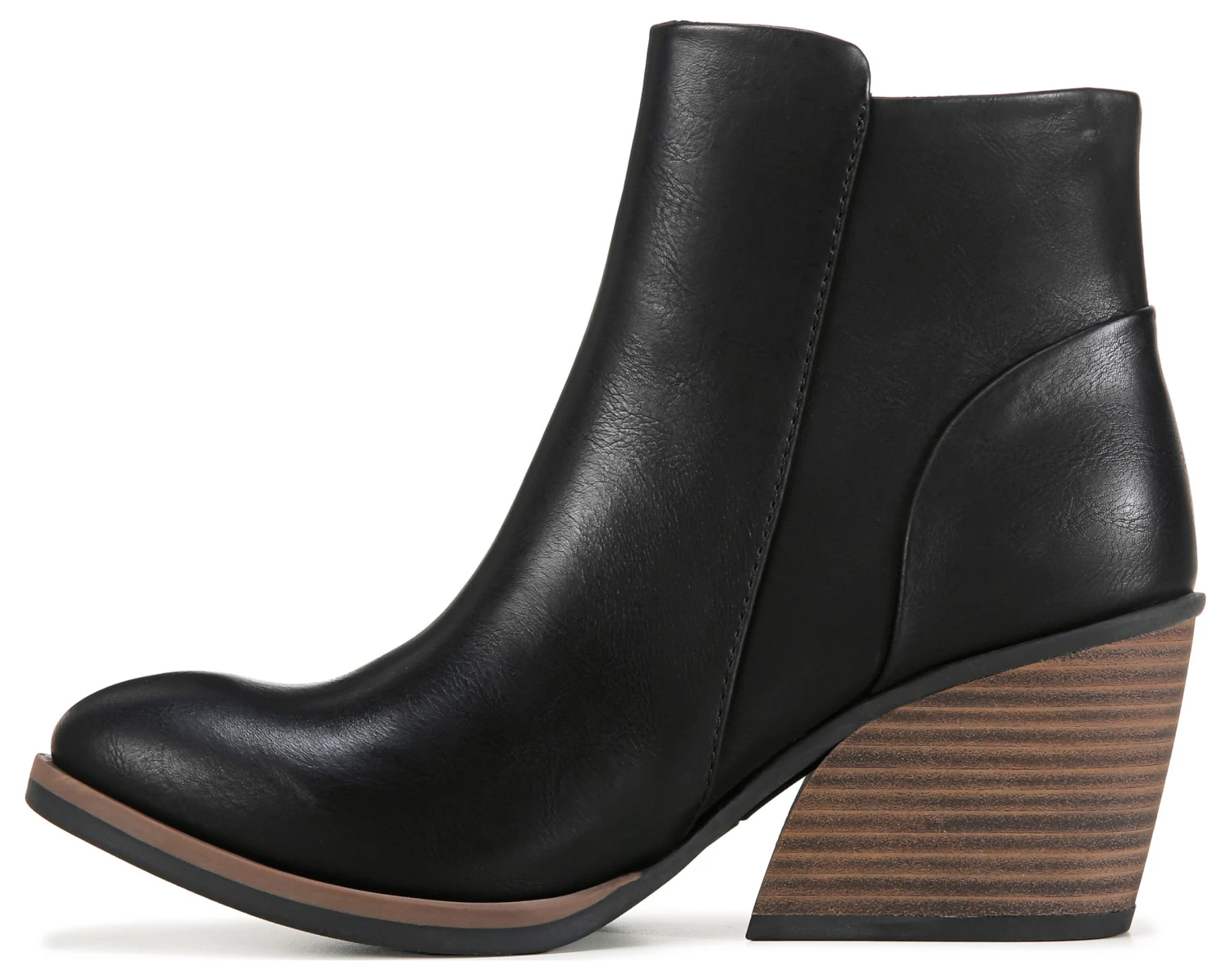 - Faux leather upper in a bootie style with an almond toe