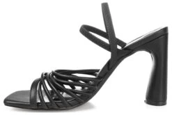 - Vegan leather upper in a dress sandal style with an open toe.