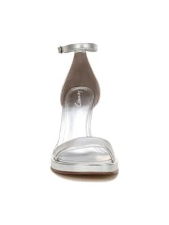 - Fabric or vegan leather upper in a dress sandal style with an open toe