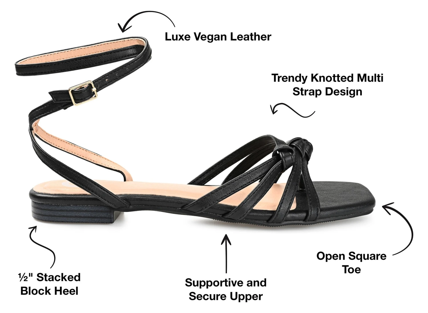 - Wraparound strap at the ankle and knot details at the toe.