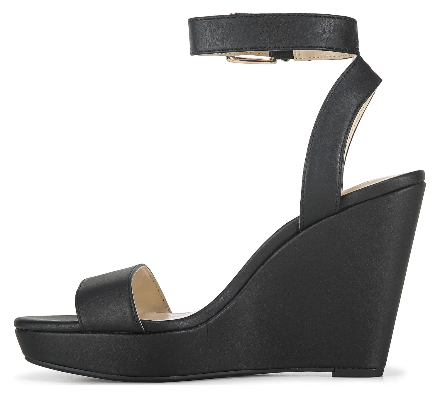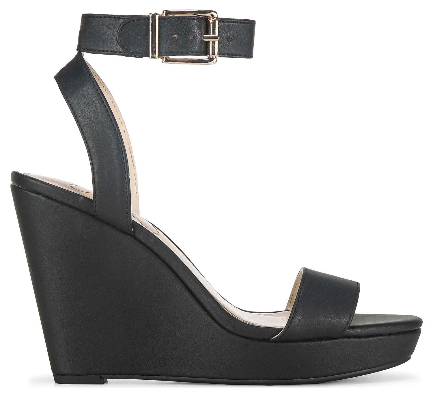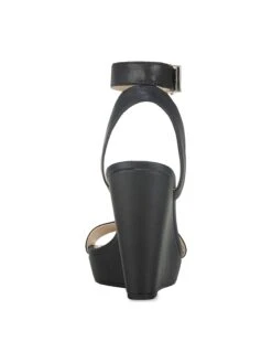 - Faux leather upper in a wedge sandal style with an open toe