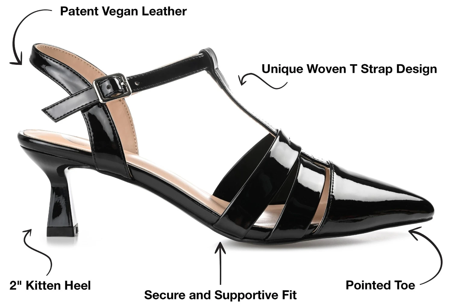 - Durable man-made outsole with a 2″ kitten heel