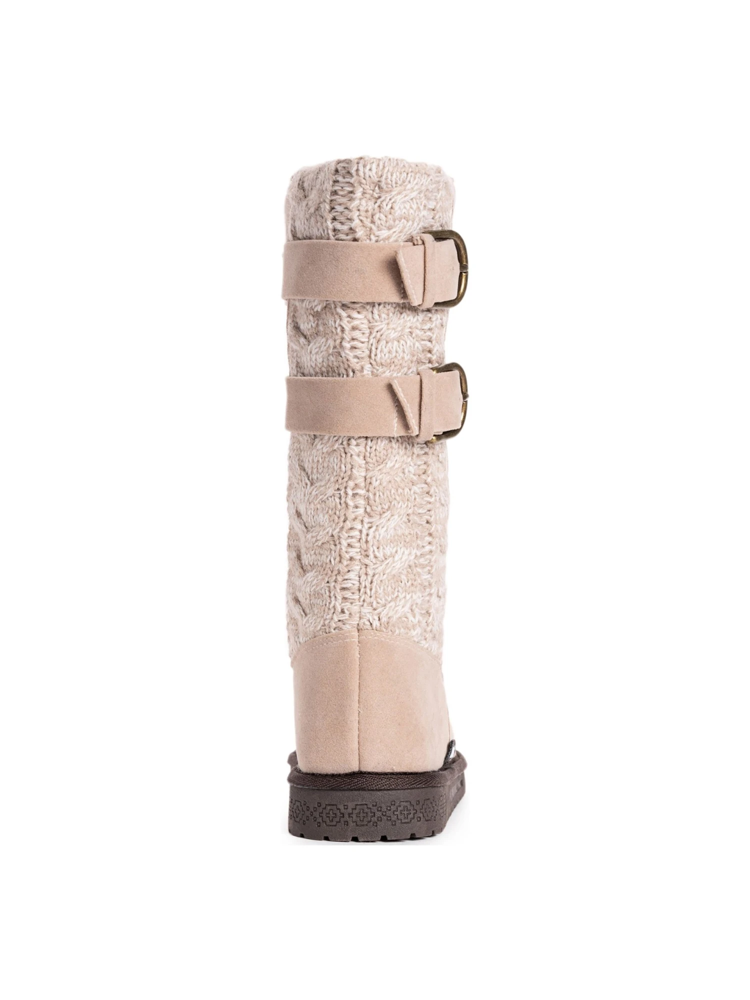 - Sweater knit accent with buckle strap details