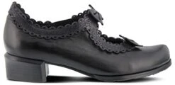 - Leather upper in a block-heel pump style with a round toe