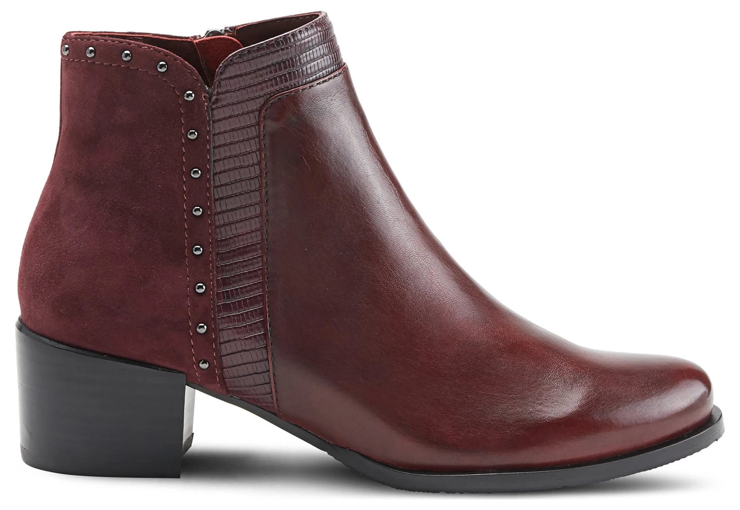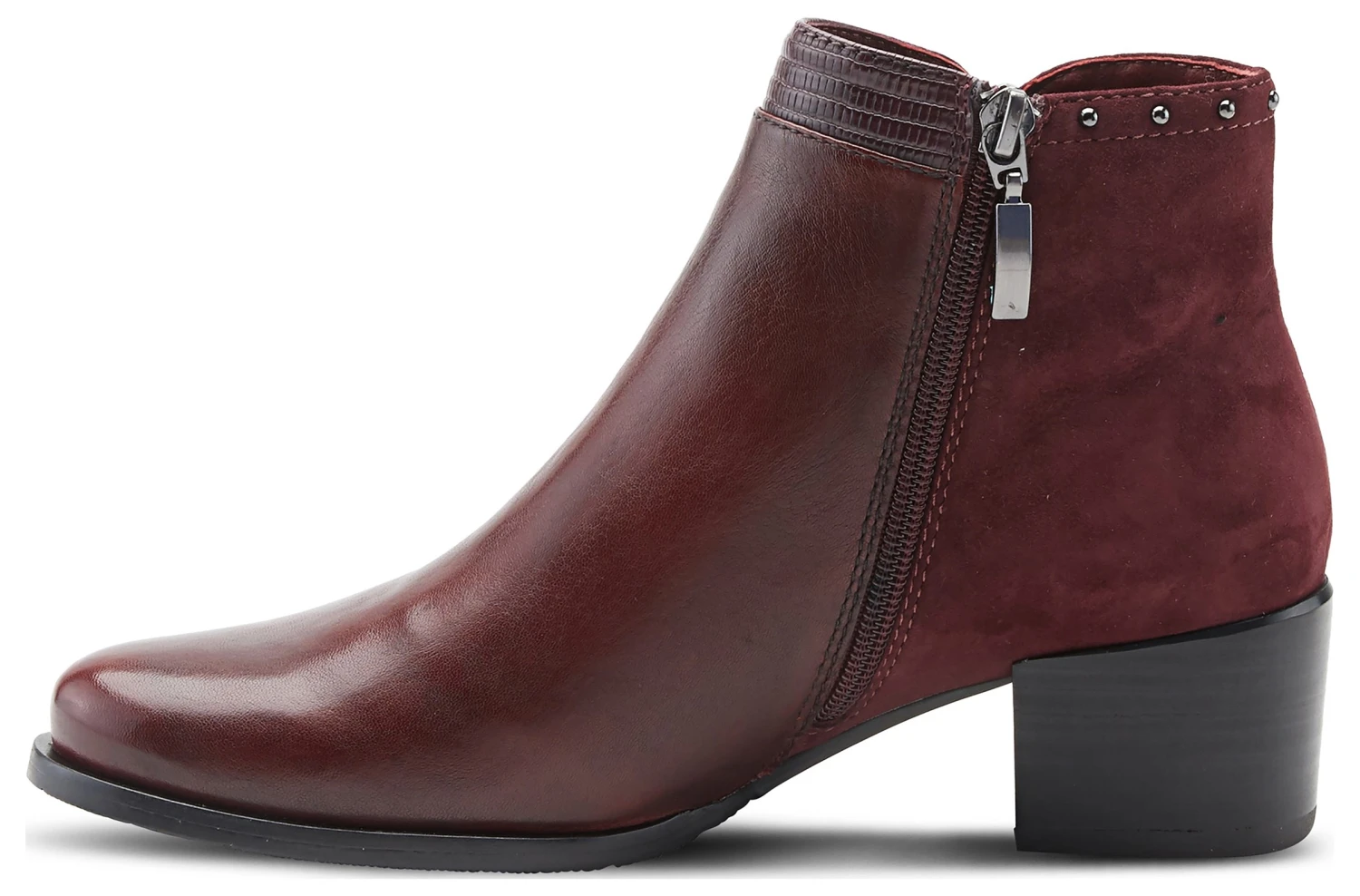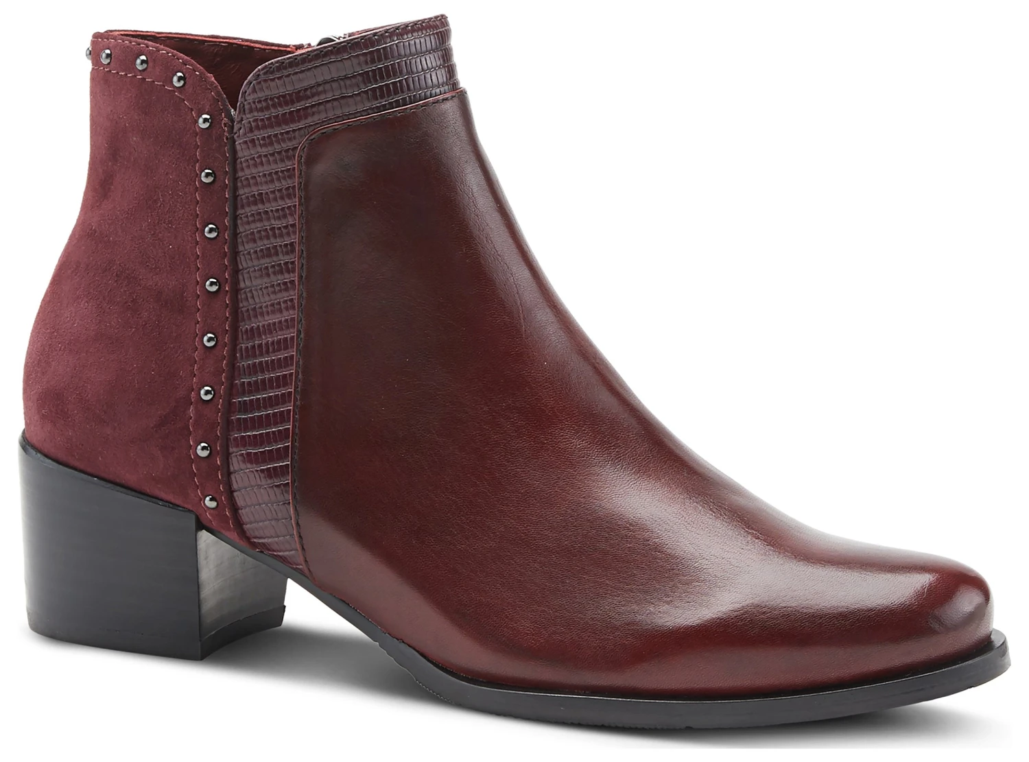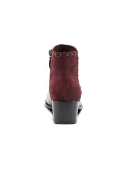 - Leather and suede upper in a block heel bootie style with a round toe