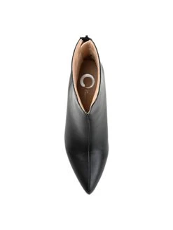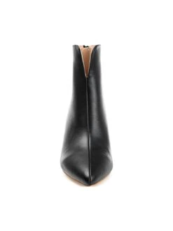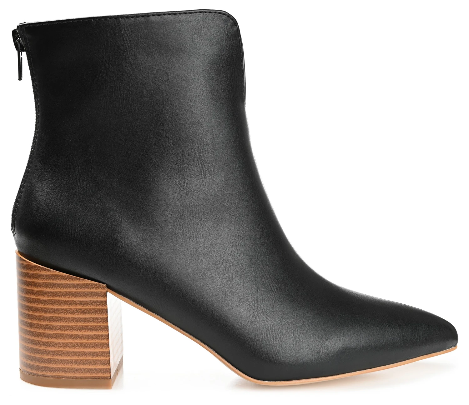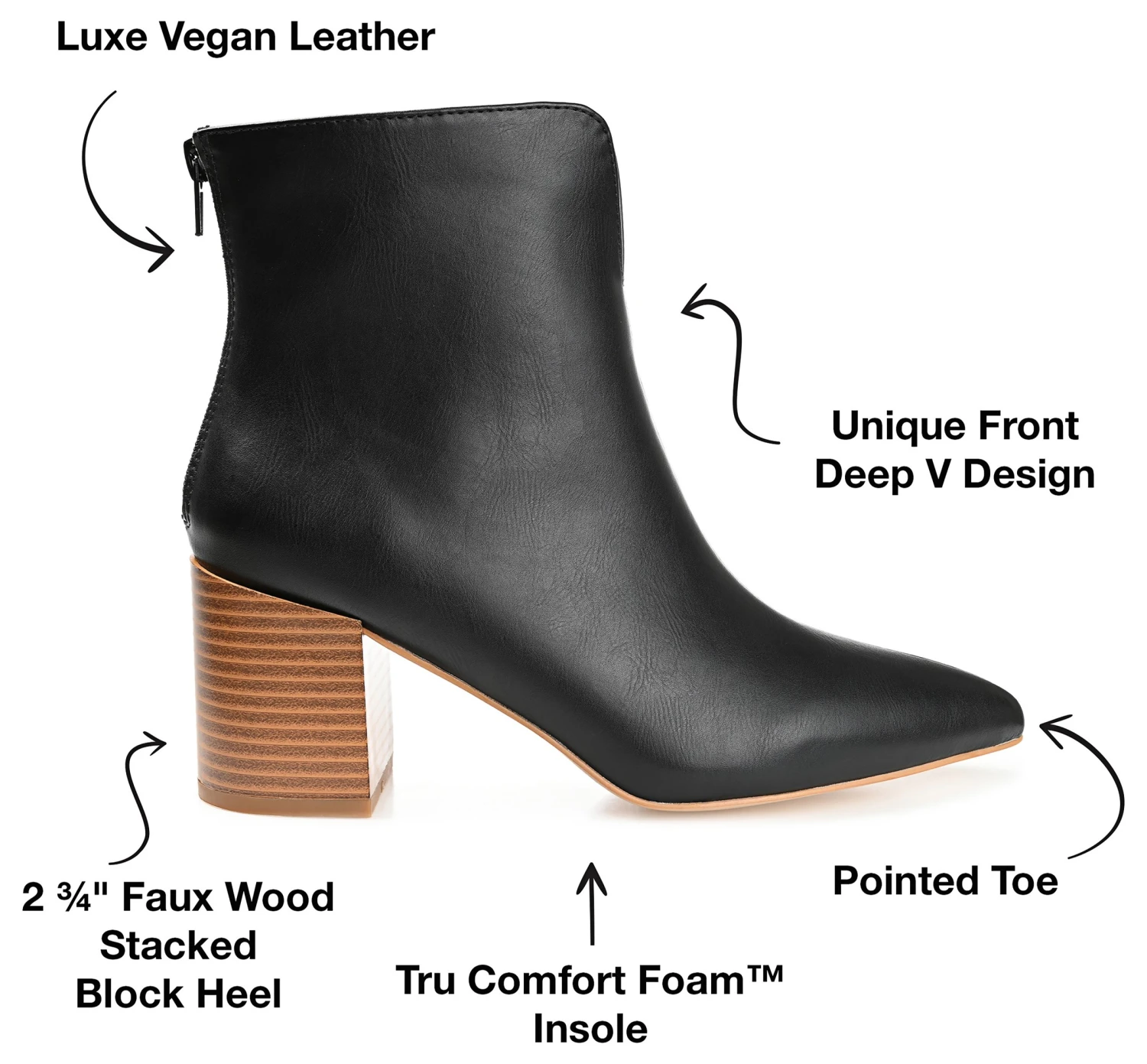 - Vegan leather upper in a block heel bootie style with a pointed toe
