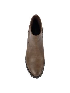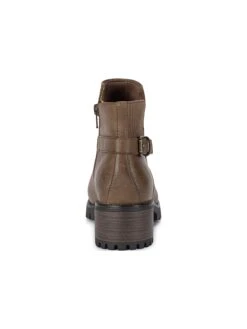 - Synthetic upper in a block heel ankle boot style with a round toe