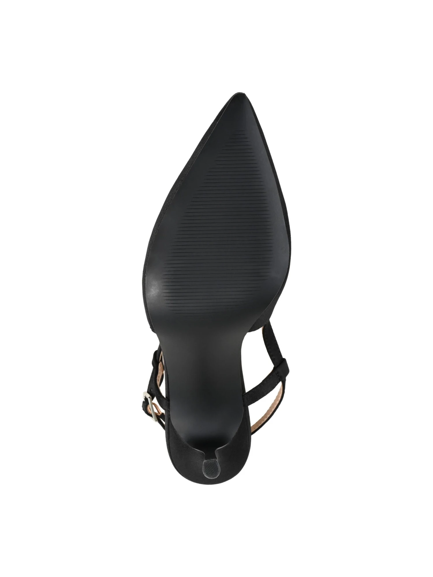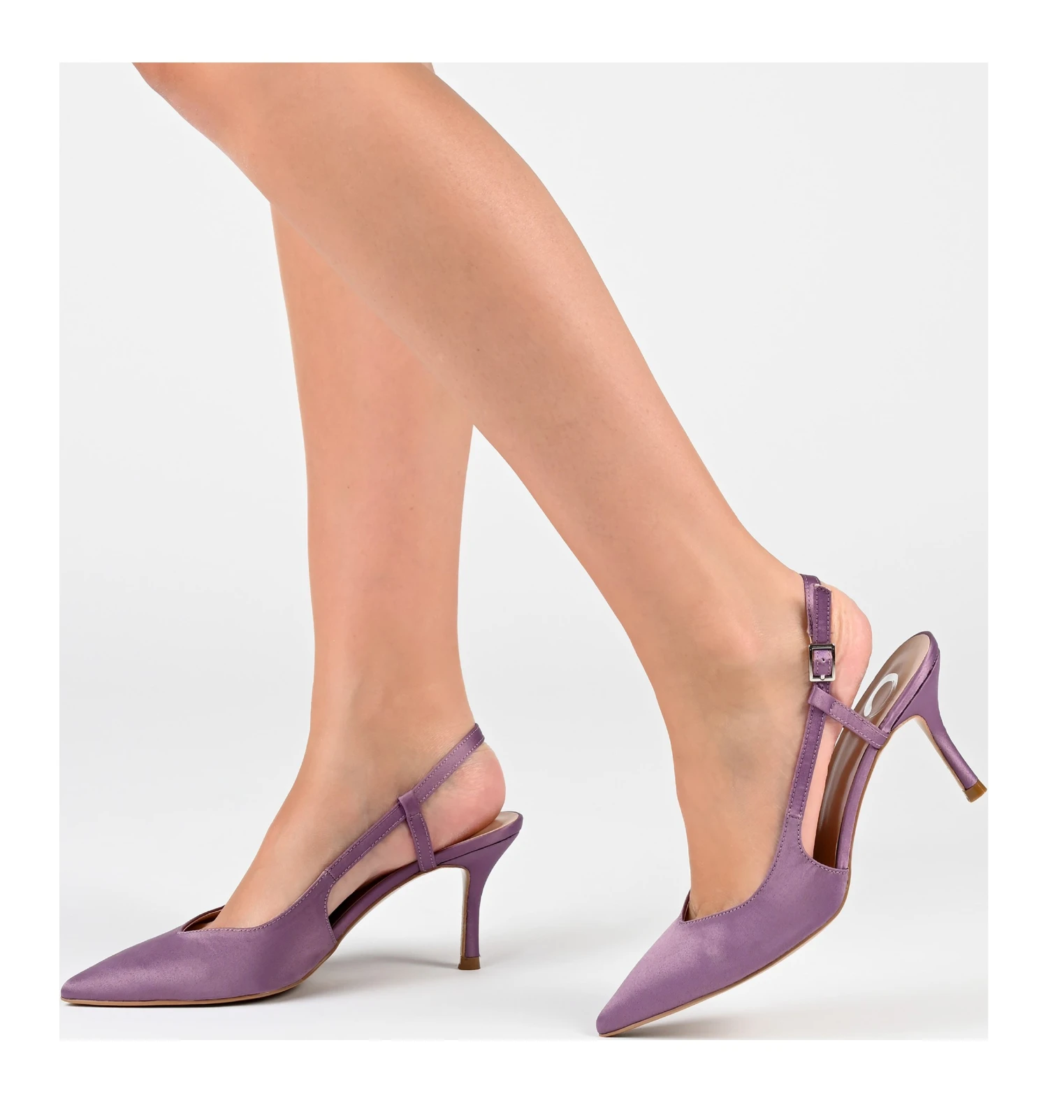 - Satin fabric upper in a slingback pump style with a pointed toe