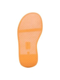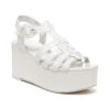 - Faux leather or fabric upper in a platform sandal style with an open toe.