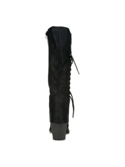 - Faux leather upper in a block heel tall boot style with an almond toe