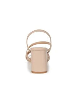 - Vegan leather upper in a block heel sandal style with an open toe.