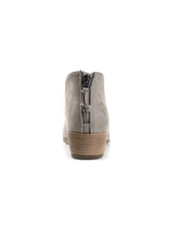 - Vegan suede upper in a block heel boot style with a round toe