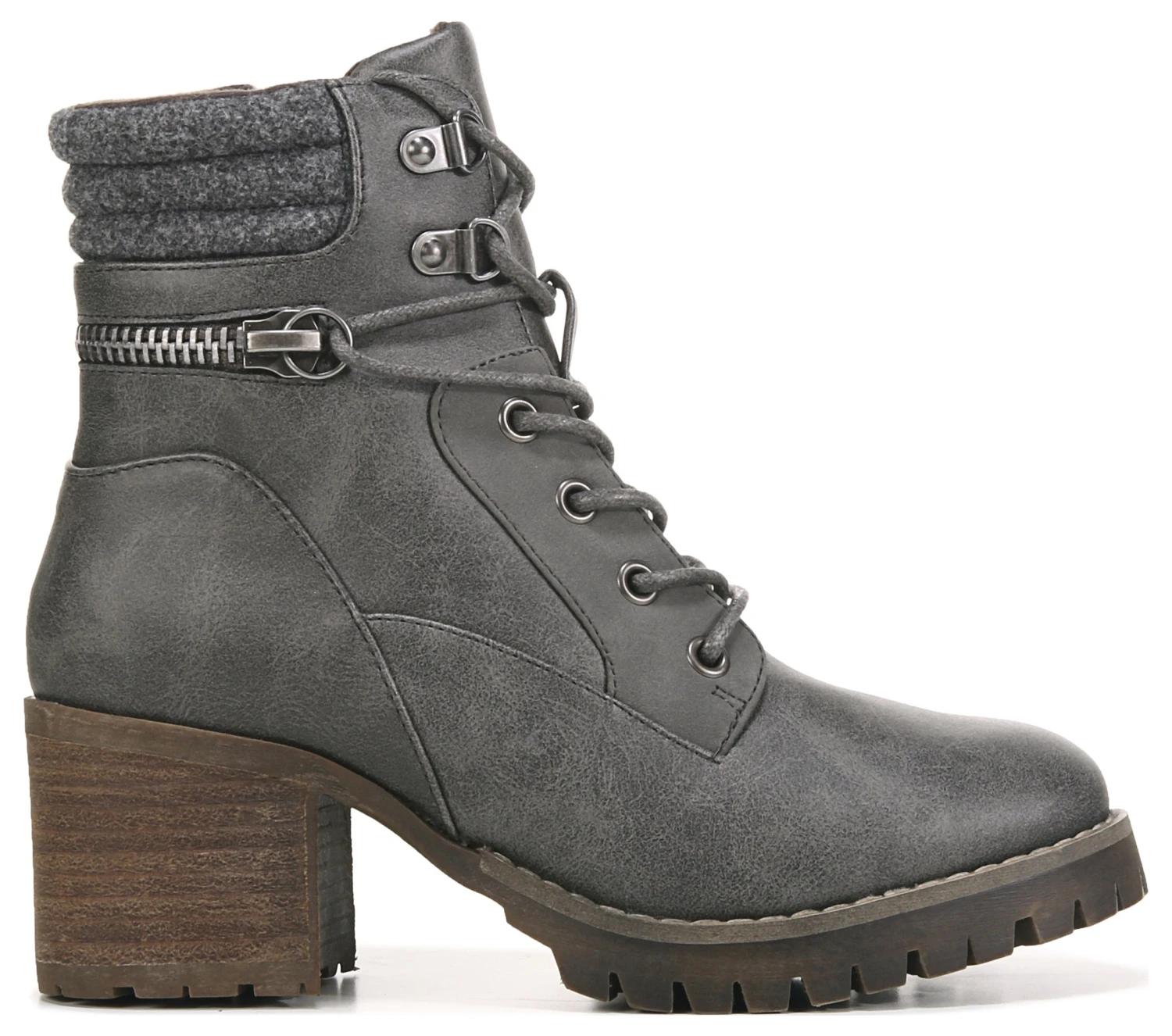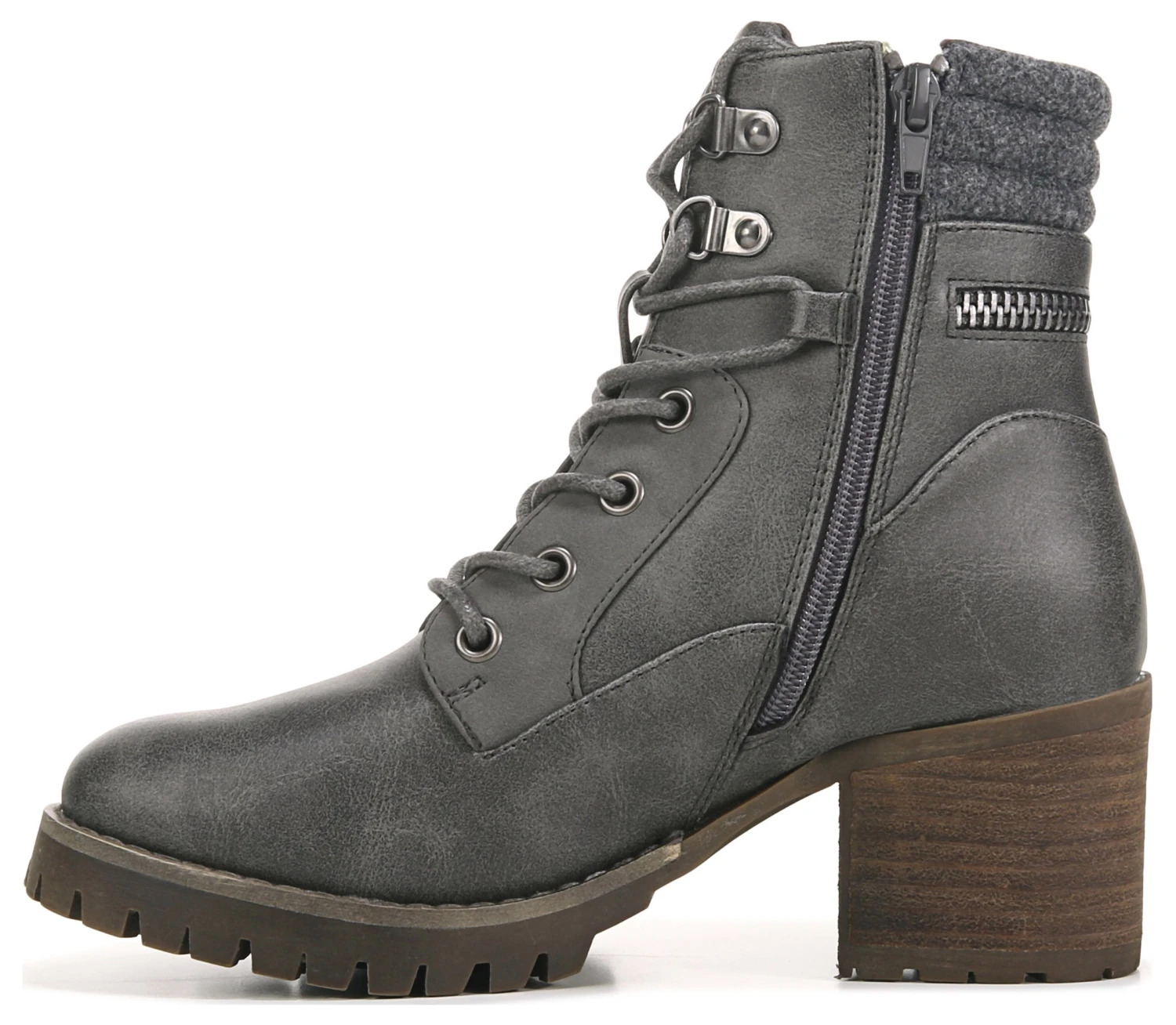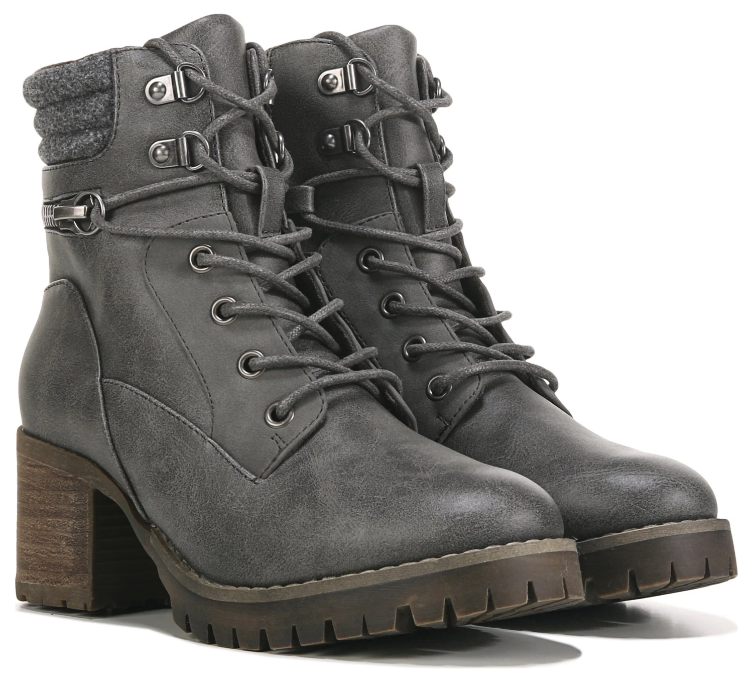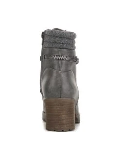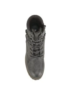 - Faux leather upper in a lace up boot style with a round toe